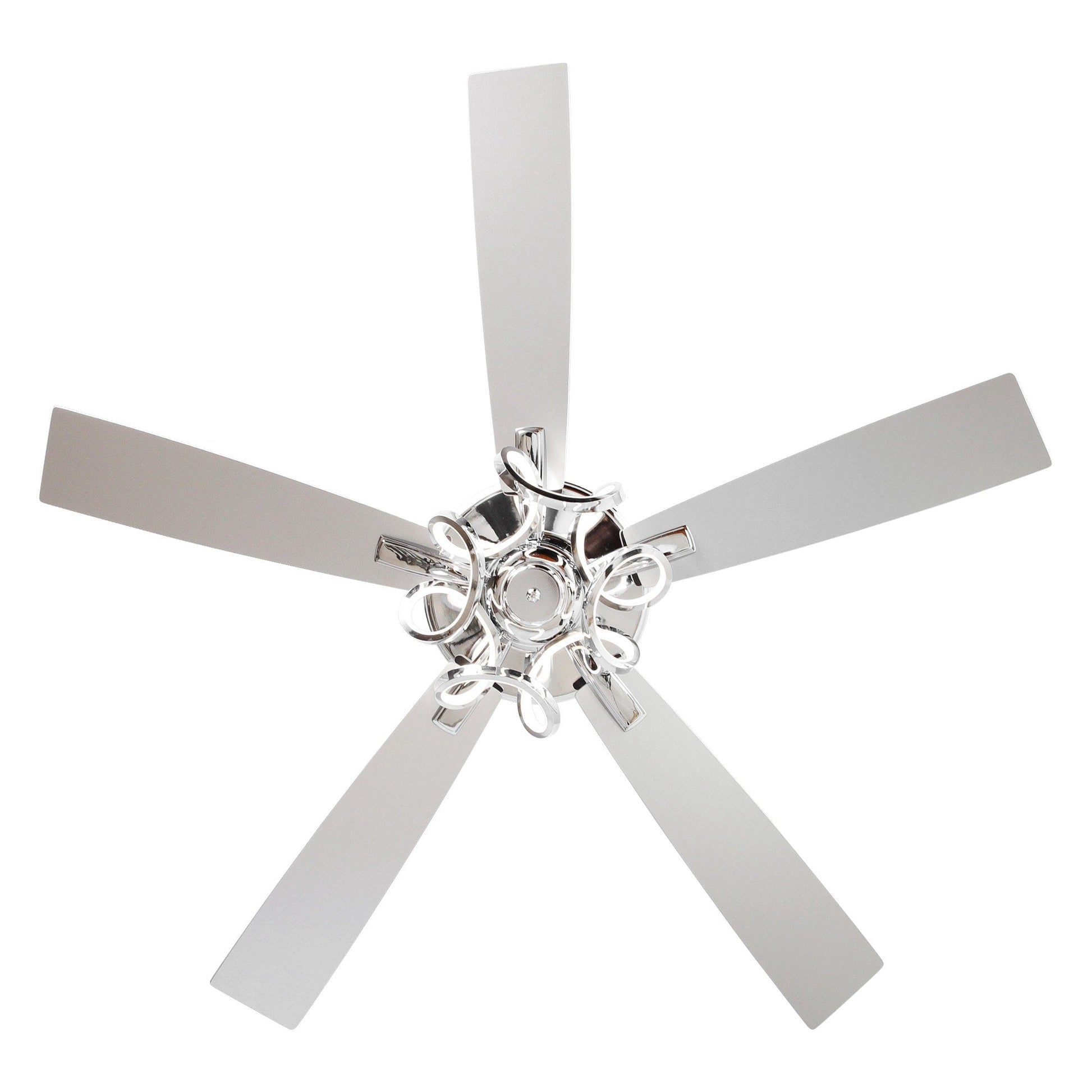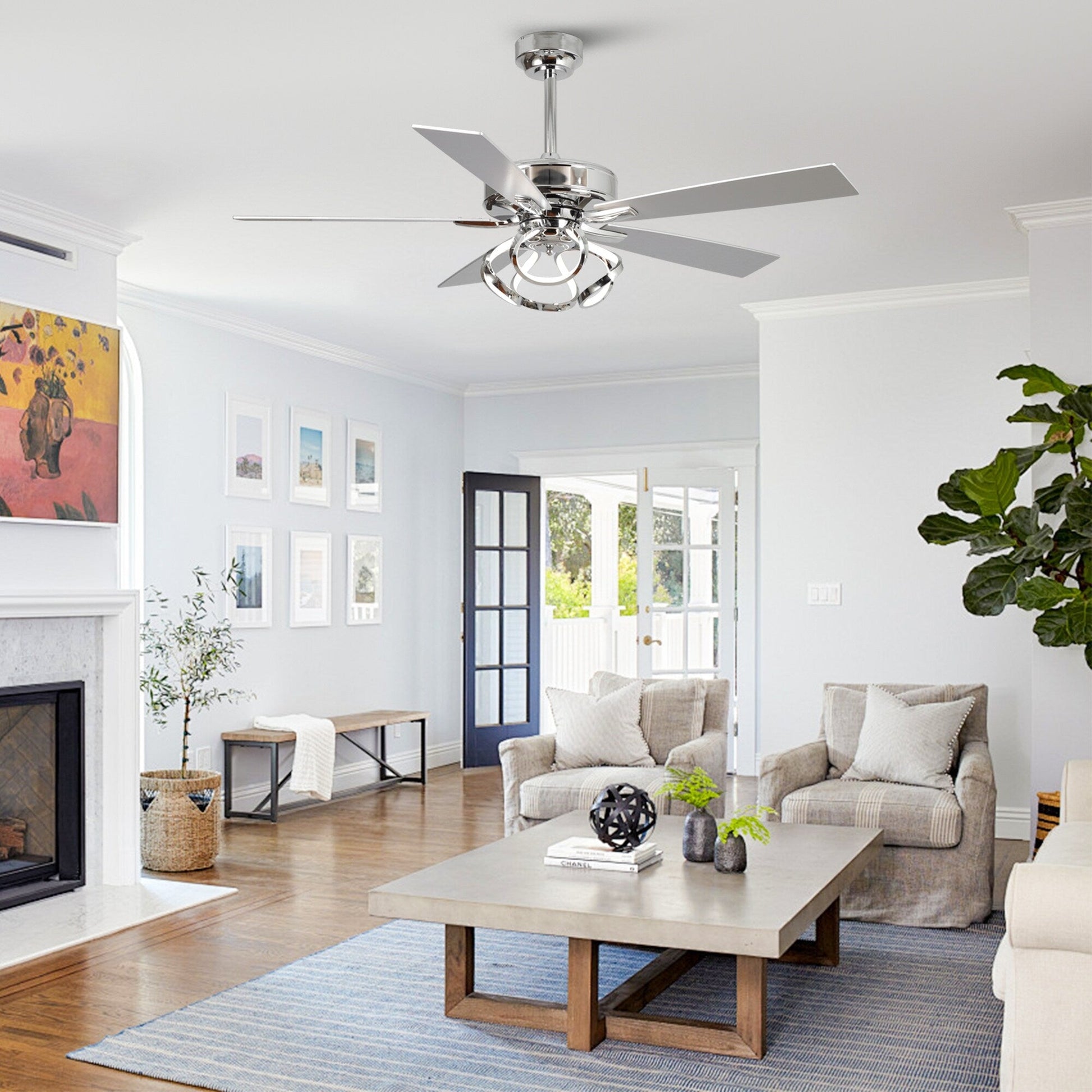 Refresh your home with this 52-inch chrome LED ceiling fan with light and remote, designed to combine sleek style with year-round comfort. The fixture features a unique twist-pattern integrated LED light band, combining modern artistry with everyday function. Five reversible blades in silver and dark brown provide versatile styling, while the quiet 6-speed DC motor delivers powerful airflow up to 3920 CFM. The integrated 24W LED light offers three color temperatures (3000K/4000K/6000K) with dimmable brightness, giving you complete control of the room’s atmosphere. A convenient handheld remote makes it easy to adjust speed, lighting, and reverse mode for year-round comfort. Perfect for living rooms, bedrooms, or open-plan spaces, this fan blends effortlessly with farmhouse, transitional, and contemporary décor.