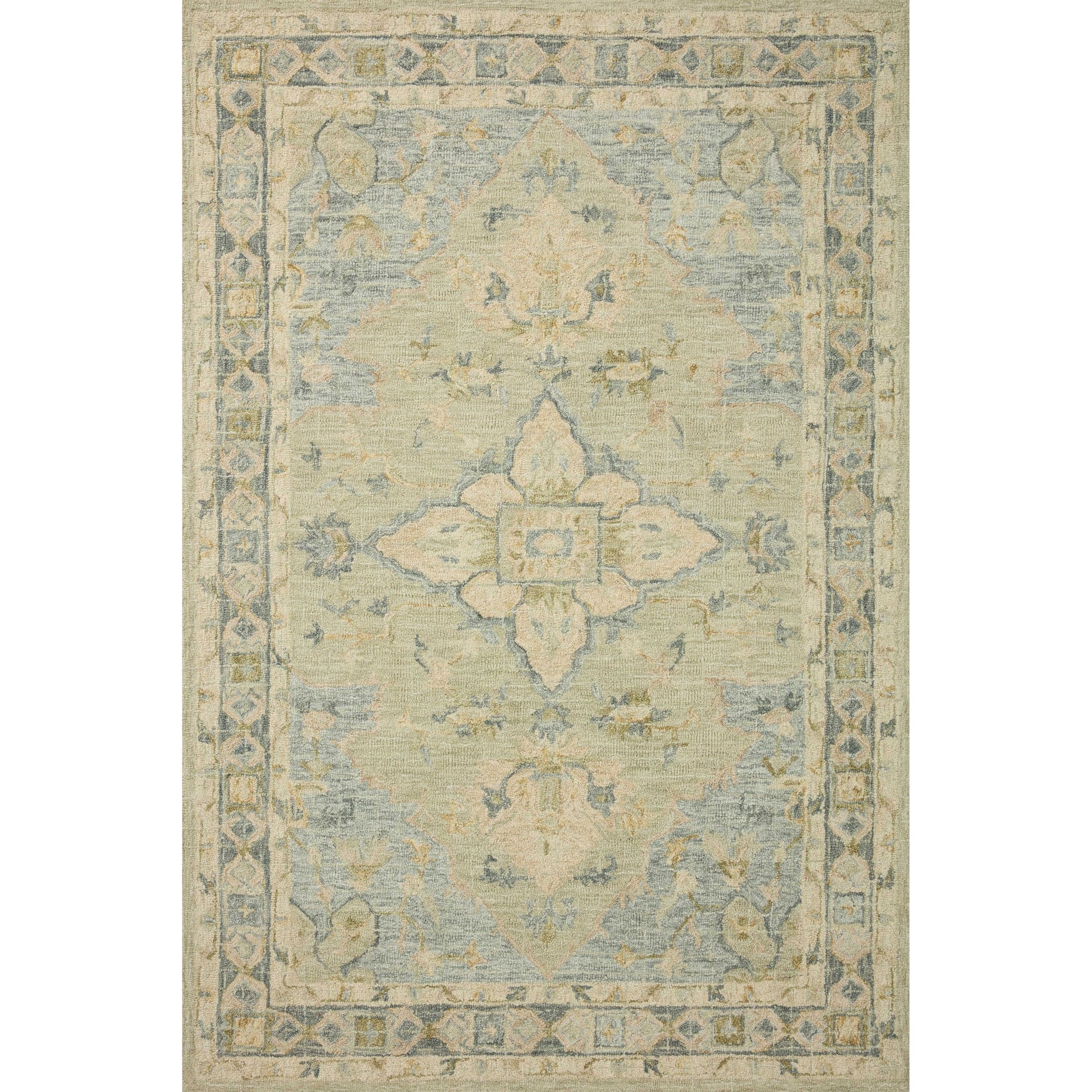 Dress up traditional decor with an area rug inspired by old-world mosaics. A loose crisscross pattern over a floral motif creates a classic look. The decorative rug is made with muted seafoam green in varying shades. Wool fibers are hand-hooked for knobby texture that enhances the distressed appearance.