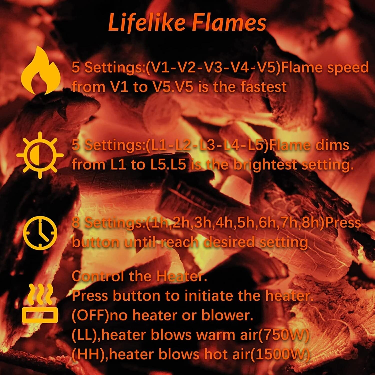 - ✅【Realistic Flame Effect】: This fireplace can be used with or without heat and features 3D realistic flame effects, which is the perfect addition to your living room or dining area. 12 flame colors includes the upgraded 3 classic flame colors (red orange and blue),5 flame speeds & 5 flame brightness and 4 carbon fire colors option. The magnificent effect can be operated with or without heat ,giving your room a dreamlike ambiance.