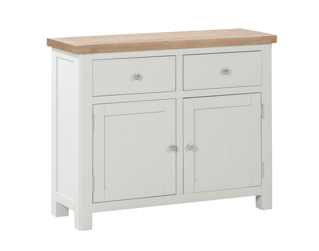 Ce petit buffet entièrement assemblé comprend deux grands tiroirs et deux placards séparés. Chacun est doté d'une étagère amovible et réglable. Le plateau en chêne clair naturel présente des angles arrondis, complétés par les bords arrondis qui courent le long du bord avant du corps peint. Les tiroirs et les portes sont équipés de petits boutons ronds en chrome brossé. Il est également fourni avec des poignées coupelles si vous préférez un style différent (veuillez noter que ces poignées coupelles ne peuvent être installées qu'une seule fois sur le meuble, car elles sont munies de goujons de fixation au dos de la plaque). Grâce à son format compact, ce meuble trouvera sa place dans le salon, la salle à manger ou même dans l'entrée.
