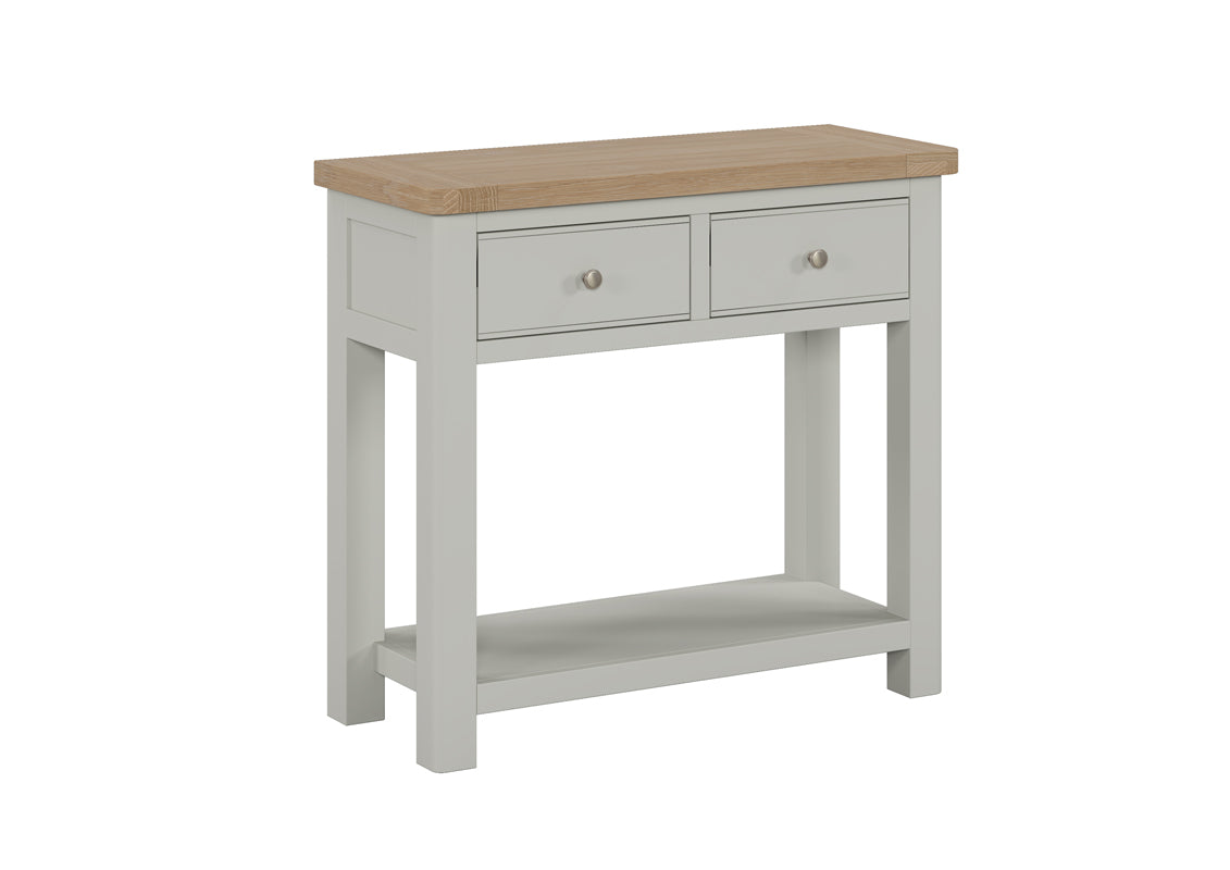 Cette console est dotée de deux grands tiroirs et d'une étagère fixe pratique. Son plateau en chêne naturel présente des angles arrondis, mis en valeur par le bord arrondi qui longe le bord avant du corps peint. Les tiroirs sont équipés de petits boutons ronds en chrome brossé, ainsi que de poignées coupelles si vous préférez un style différent (veuillez noter que ces poignées coupelles ne peuvent être installées qu'une seule fois sur le meuble, car elles sont munies de goujons de fixation au dos de la plaque de fixation). Livrée partiellement assemblée, il suffit de fixer les pieds et l'étagère. Cet article est idéal pour embellir une entrée, mais peut également être utilisé dans n'importe quelle pièce de la maison.