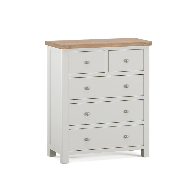 Cette commode entièrement assemblée comprend 2 petits et 3 grands tiroirs. Le plateau en chêne clair naturel présente des angles arrondis, mis en valeur par les bords arrondis qui longent le bord avant du corps peint. Les tiroirs sont équipés de petits boutons ronds en chrome brossé et sont également fournis avec des poignées coupelles si vous préférez un style différent (veuillez noter que ces poignées coupelles ne peuvent être installées qu'une seule fois sur le meuble, car elles sont munies de goujons de fixation au dos de la plaque). Ce meuble convient à une utilisation dans une chambre principale ou une chambre d'amis.