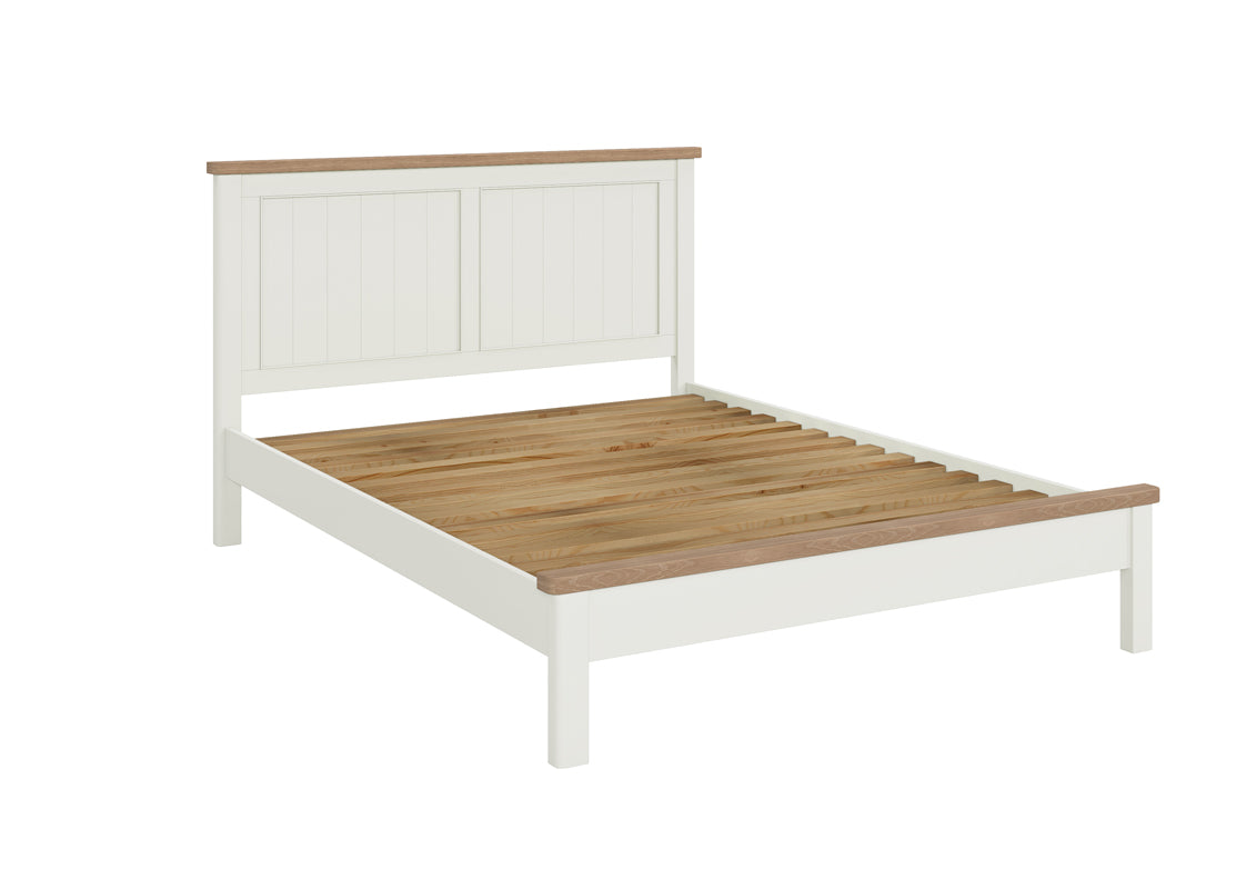 Ce cadre de lit king size robuste peut accueillir tout matelas standard de 1,50 m. Un assemblage minimal est requis, toutes les fixations étant déjà fixées au cadre. Les lattes s'insèrent dans des rainures pré-percées, prêtes à être fixées au cadre si nécessaire. Il est doté d'une tête de lit haute avec un élégant design à rainures et languettes et d'un pied de lit bas, tous deux dotés d'un plateau arrondi en chêne naturel et de bords arrondis sur une surface peinte. Également disponible en cadre de lit double de 1,40 m.