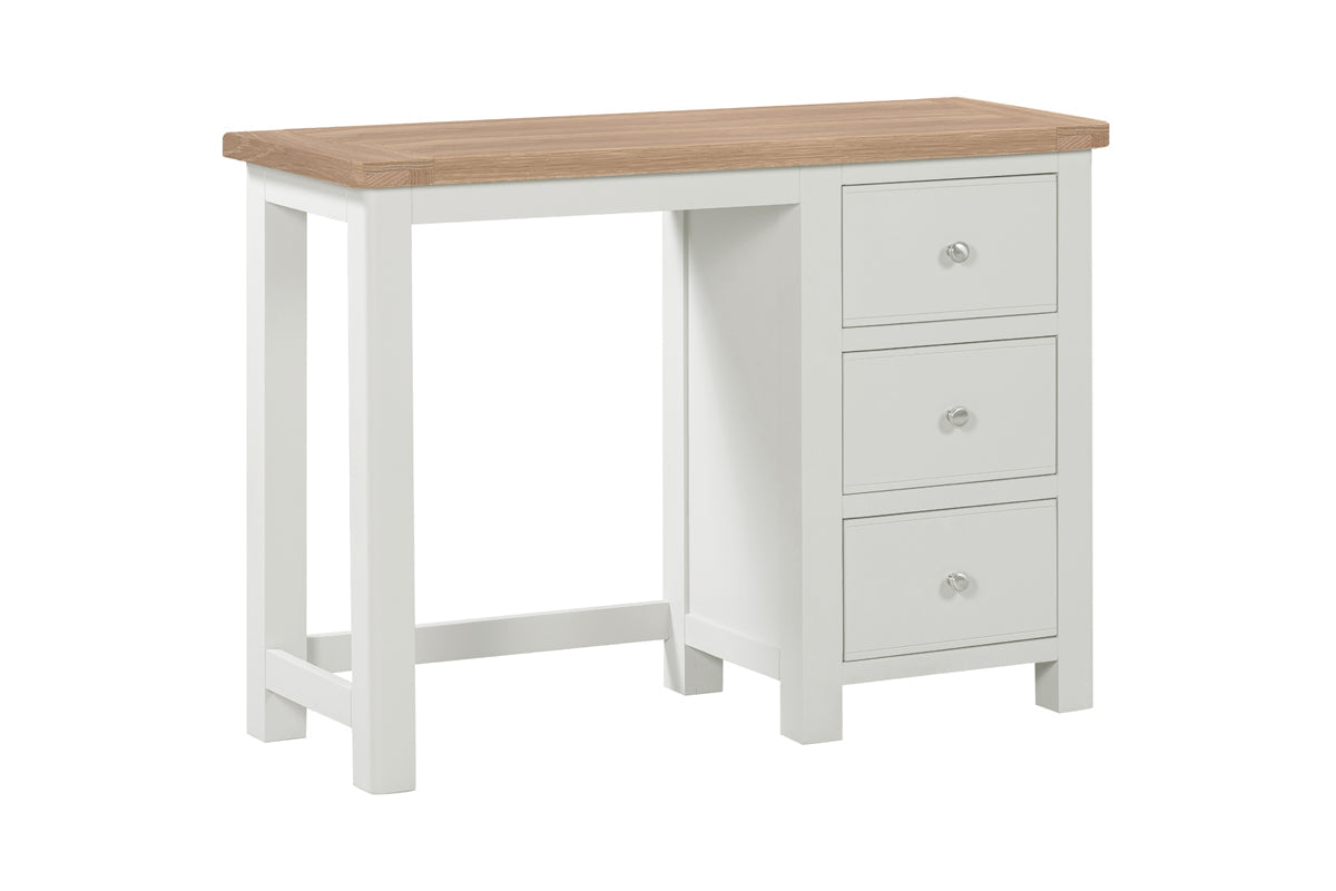 Cette coiffeuse entièrement assemblée constitue également un bureau compact idéal pour le télétravail. Elle est dotée de trois tiroirs pratiques et d'une ouverture pour un tabouret (également disponible) ou une chaise. Un miroir sur pied est également disponible. Le plateau en chêne clair naturel présente des angles arrondis, complétés par les bords incurvés qui courent le long du bord avant du corps peint. Elle est également équipée de petits boutons ronds en chrome brossé et de poignées coupelles pour un look original. (Veuillez noter que ces poignées coupelles ne peuvent être installées qu'une seule fois sur le meuble, car elles sont munies de goujons de fixation à l'arrière de la plaque de fixation.)