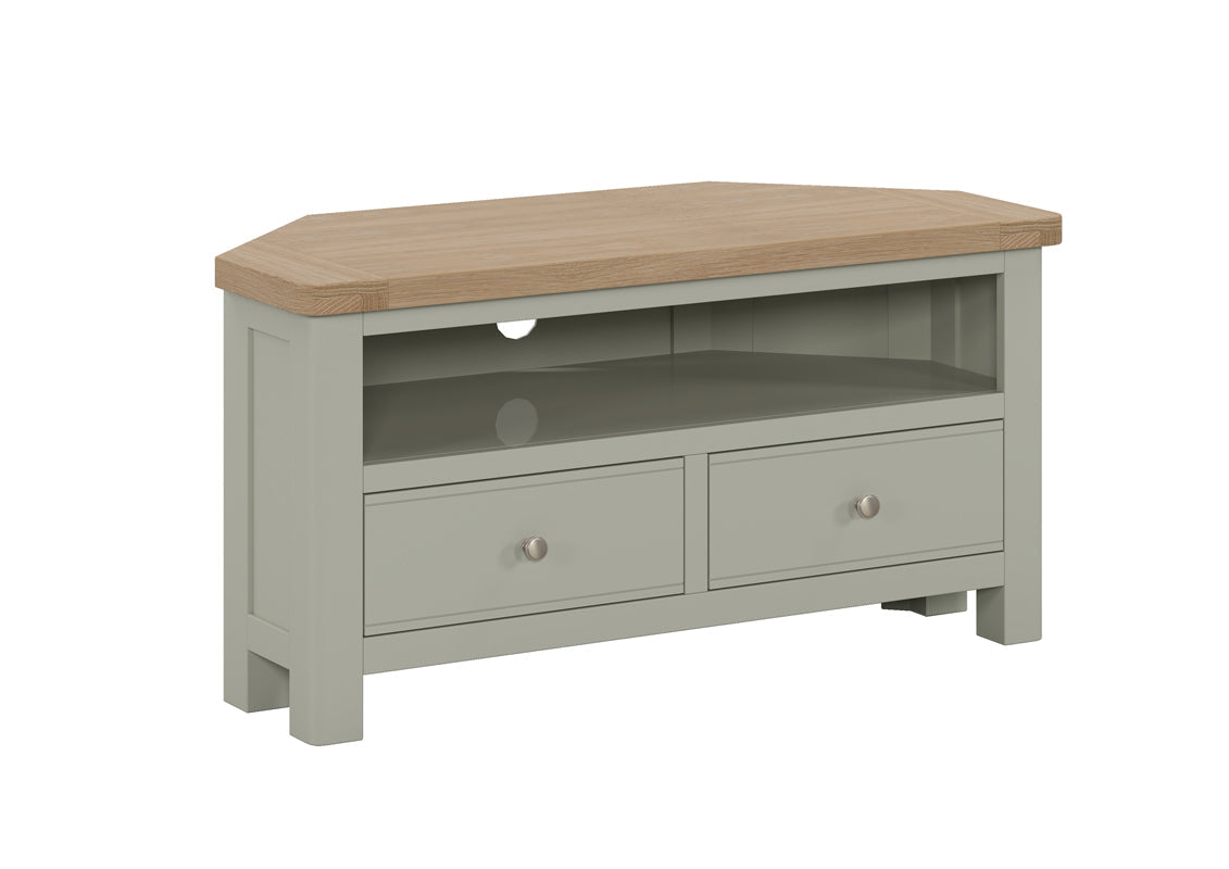 Ce meuble TV d'angle entièrement assemblé est doté de deux grands tiroirs pratiques pour vos câbles de rechange, télécommandes, etc., ainsi que d'une grande ouverture pour une Sky Box, une barre de son, un lecteur DVD, etc. Le plateau en chêne naturel présente des angles arrondis, complétés par les bords arrondis qui longent le bord avant du corps peint. Les tiroirs sont équipés de petits boutons ronds en chrome brossé et sont également fournis avec des poignées coupelles si vous préférez un style différent (veuillez noter que ces poignées coupelles ne peuvent être installées qu'une seule fois sur le meuble, car elles sont dotées de goujons de positionnement au dos de la plaque de fixation). Ce nouveau design épuré s'intégrera parfaitement dans tous les recoins de votre pièce.