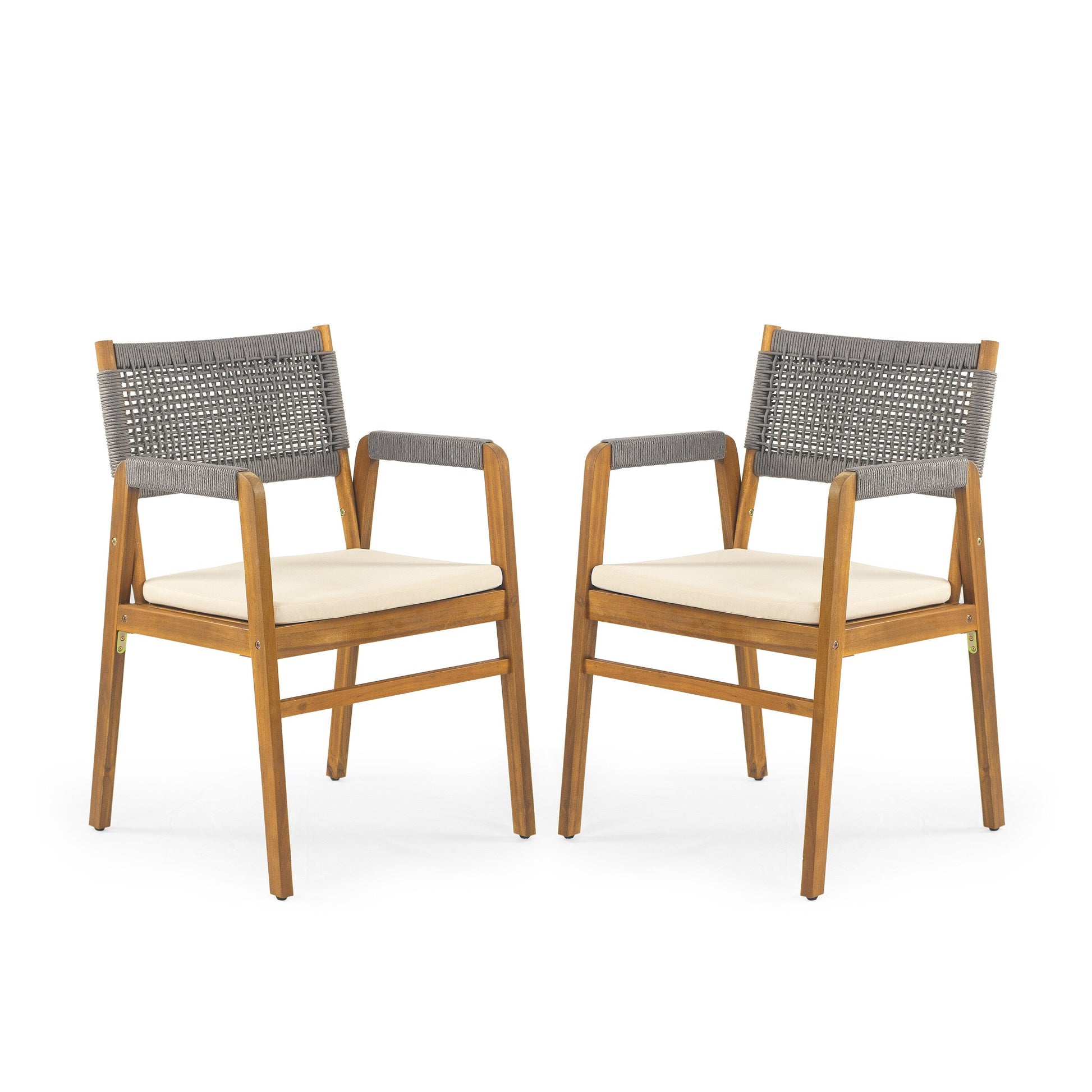 Upgrade your outdoor space with this stylish acacia wood furniture set. The set includes two chairs with comfortable rope-woven backrests and a matching acacia wood bistro table with a sleek teak finish. The durable, weather-resistant design is perfect for long-lasting use. Easy to assemble with tools included. Chair dimensions: 21.50' W x 21.50' D x 32.75' H. Table dimensions: 31.50' W x 31.50' D x 30.00' H.