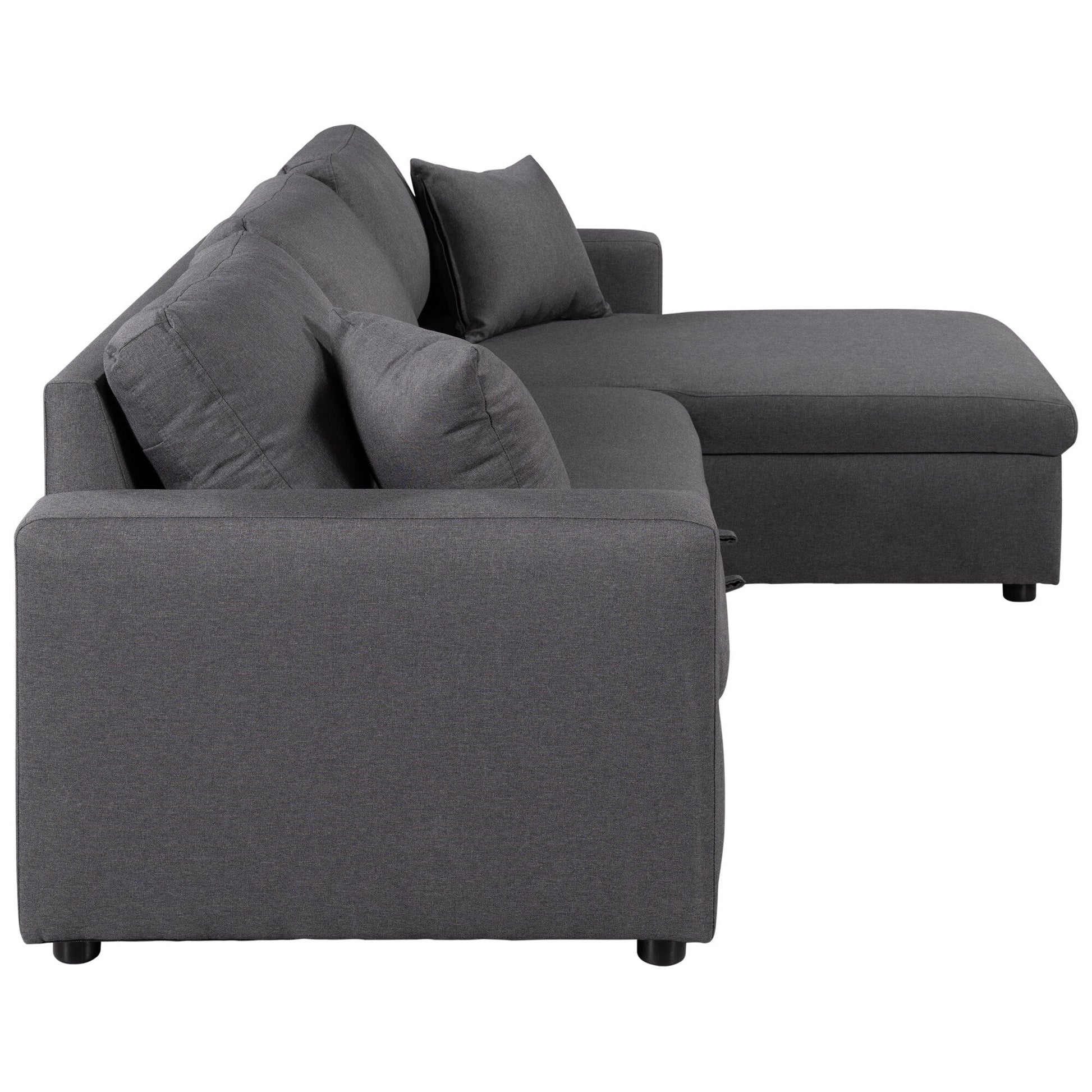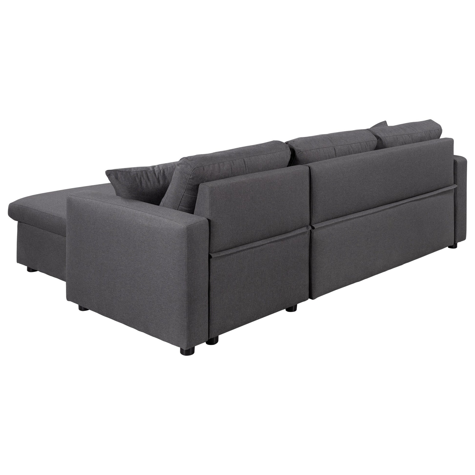 - This modern L-shaped sleeper sofa easily transforms into a bed with a pull-out handle, offering added sleeping space without taking up extra room. Featuring built-in storage, high-density foam cushions, and a soft gray fabric, it blends comfort, function, and style for everyday use.