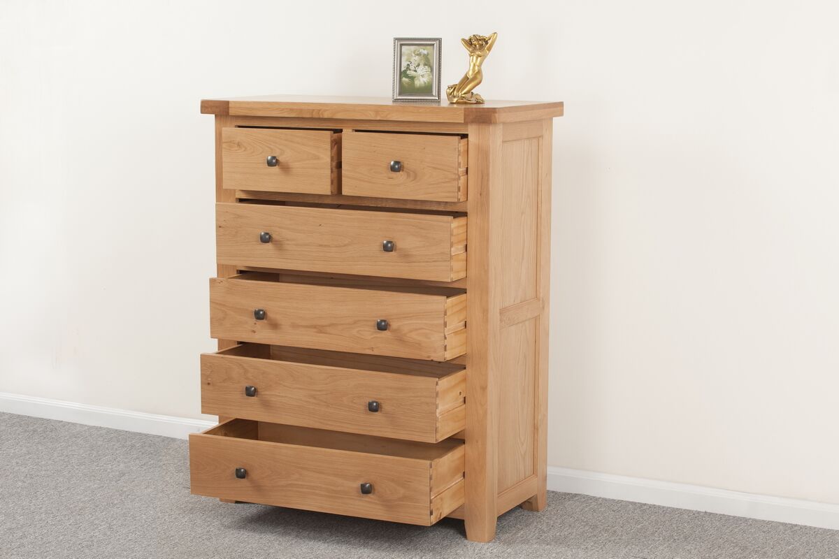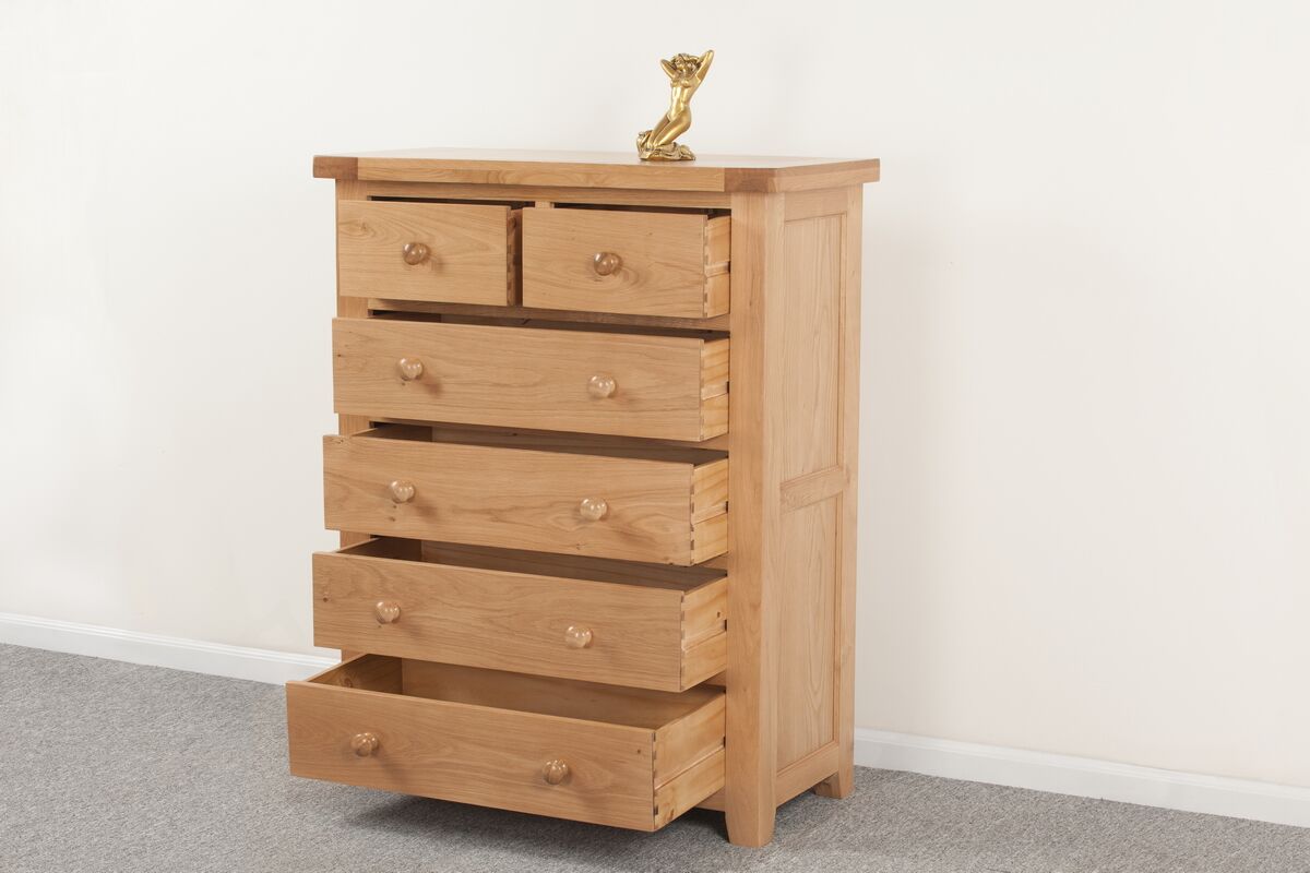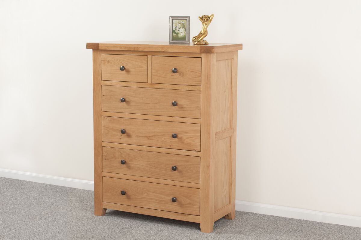 Cette commode, l'une des cinq de cette gamme, est un ajout pratique à votre chambre. Finition chêne clair, elle comprend quatre grands tiroirs et deux plus petits, avec des façades à queue d'aronde et des attaches pivotantes au dos pour plus de sécurité. Vous pouvez choisir entre des boutons traditionnels en bois ou contemporains en métal. Elle fait partie de notre gamme la plus vendue. Commandez dès maintenant pour une livraison rapide.
