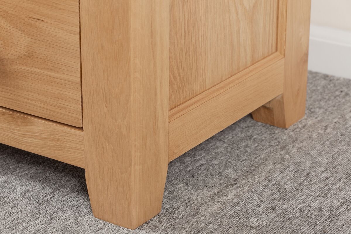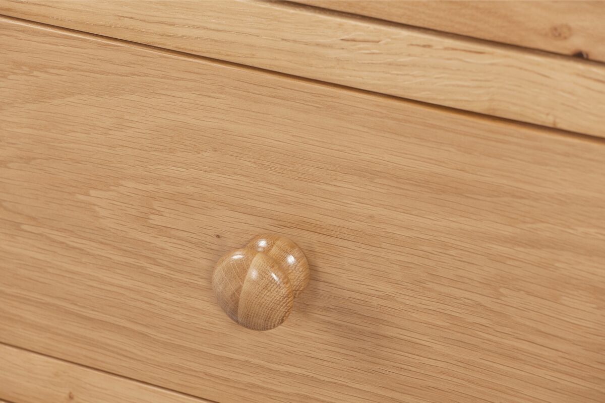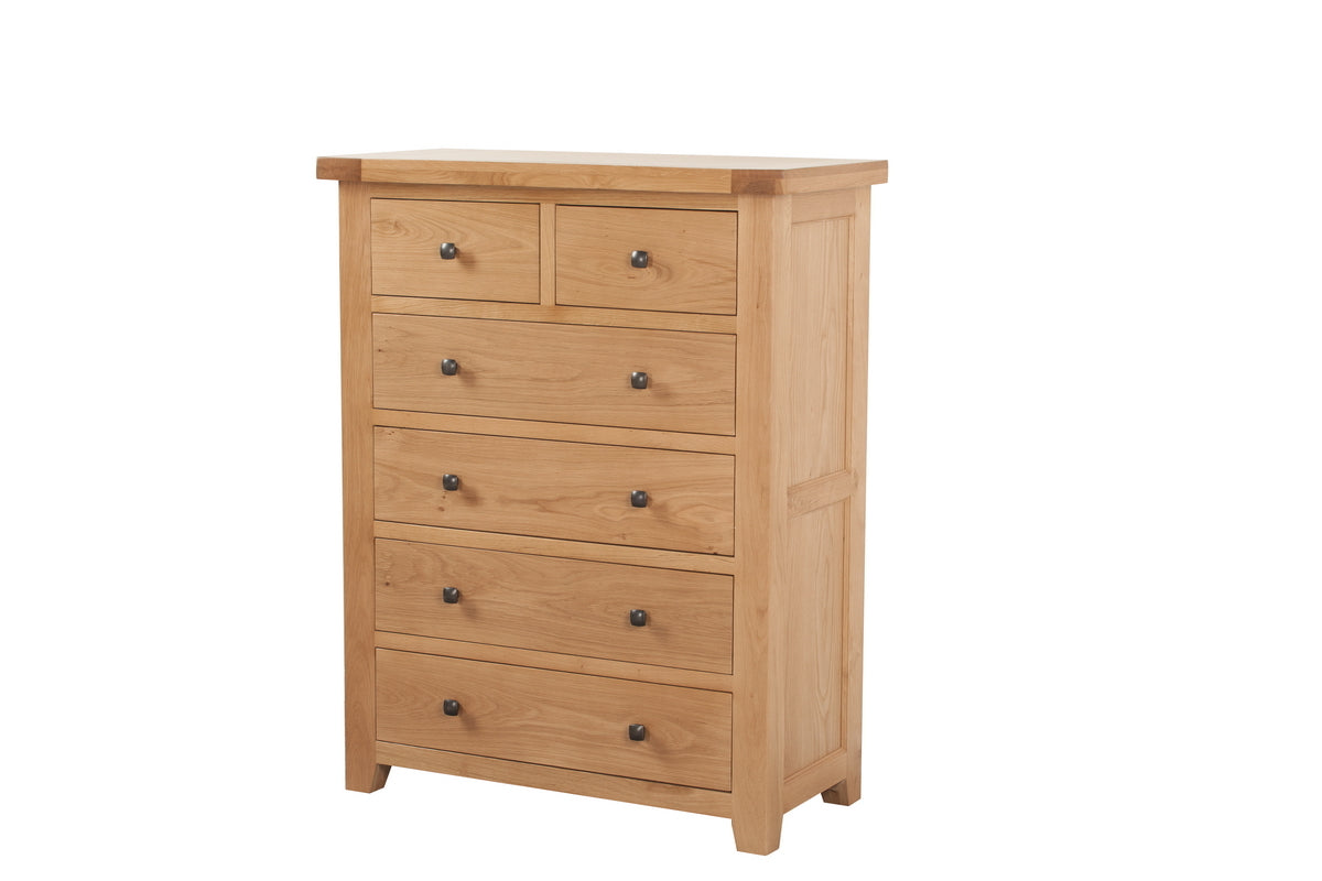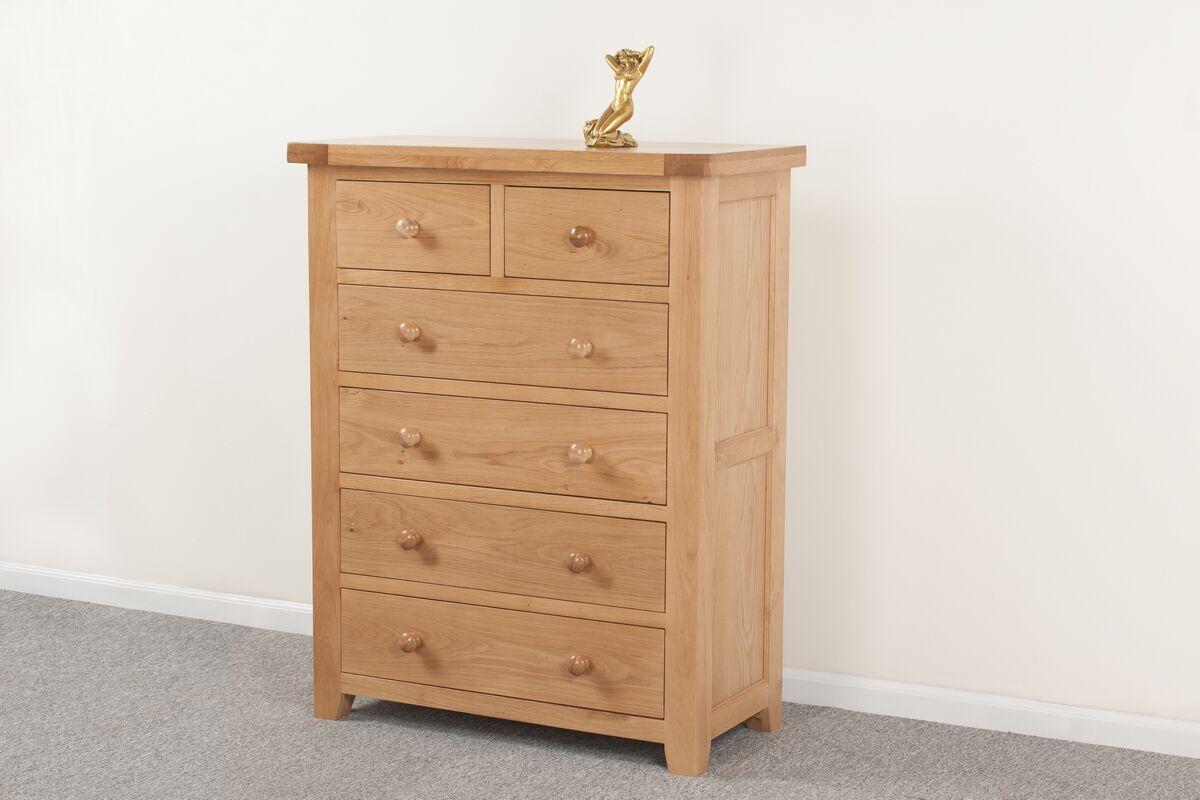 Cette commode, l'une des cinq de cette gamme, est un ajout pratique à votre chambre. Finition chêne clair, elle comprend quatre grands tiroirs et deux plus petits, avec des façades à queue d'aronde et des attaches pivotantes au dos pour plus de sécurité. Vous pouvez choisir entre des boutons traditionnels en bois ou contemporains en métal. Elle fait partie de notre gamme la plus vendue. Commandez dès maintenant pour une livraison rapide.
