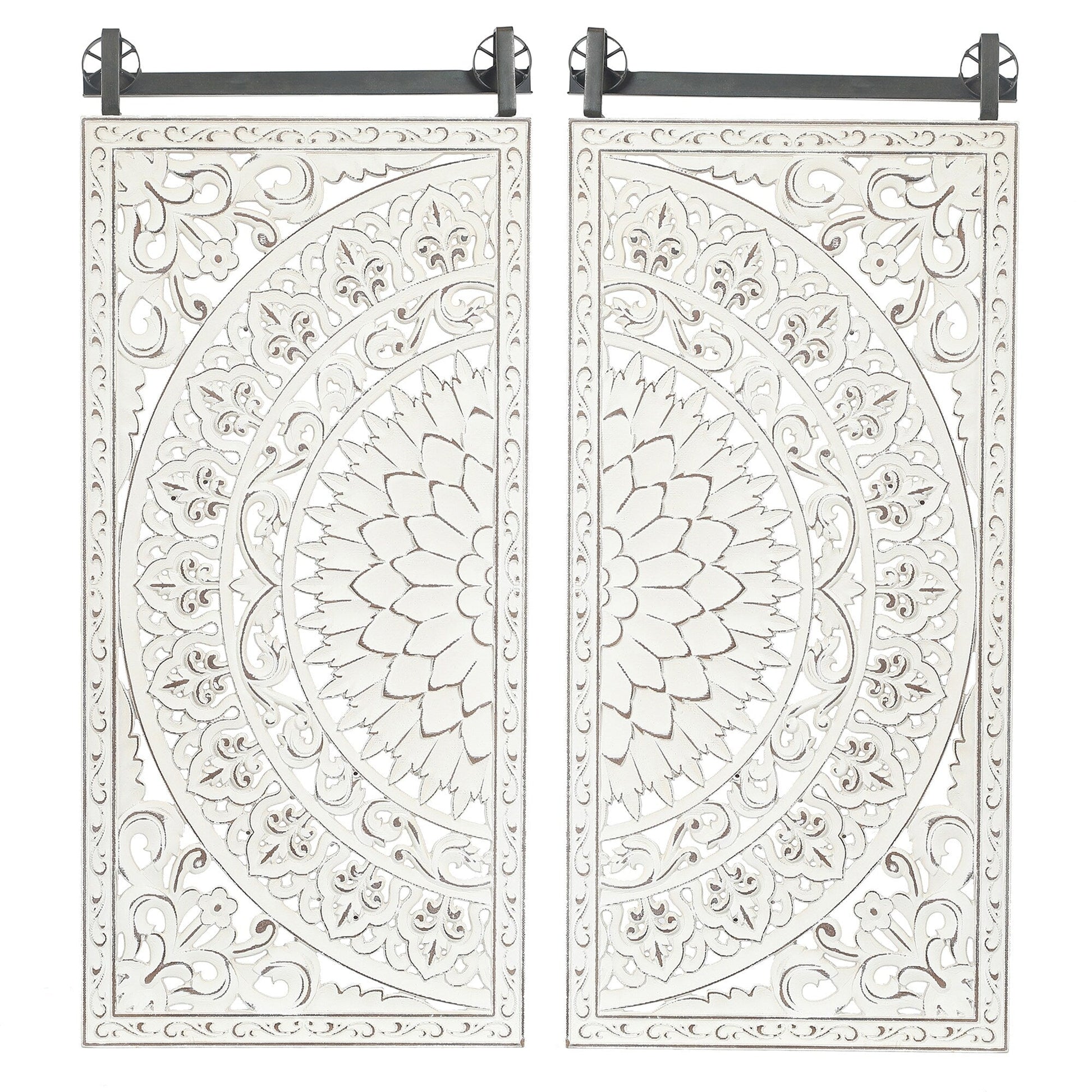 Looking to add some freshness, charm, and romance to your home decor? Look no further than this gorgeous 2-piece hand-carved floral-patterned wall decor set. Each piece is lovingly crafted from high-quality manufactured wood, with a beautiful carved flower design and raised details in soft ivory white with brown highlights for added depth and vintage appeal. The panels are attached to a sturdy weathered black iron bar, giving the set a modern farmhouse feel. Easy to mount with two metal D-ring brackets, this stunning wall art is sure to catch the eye and complement any interior design. Don't settle for a boring empty wall - give it the lift it deserves with this beautiful floral wall decoration.