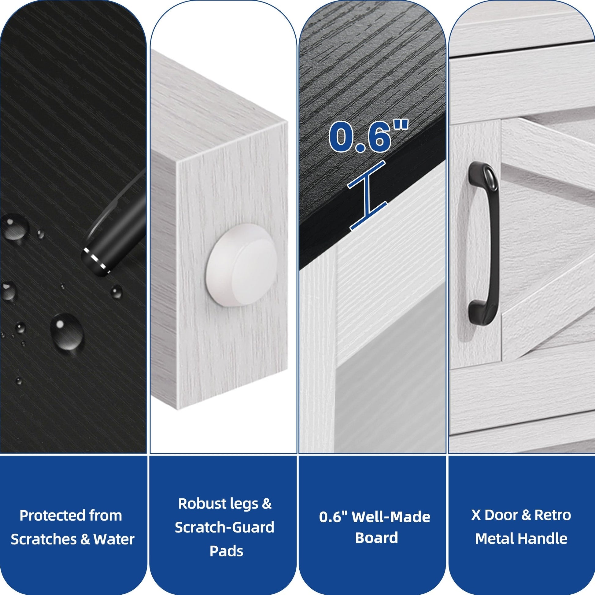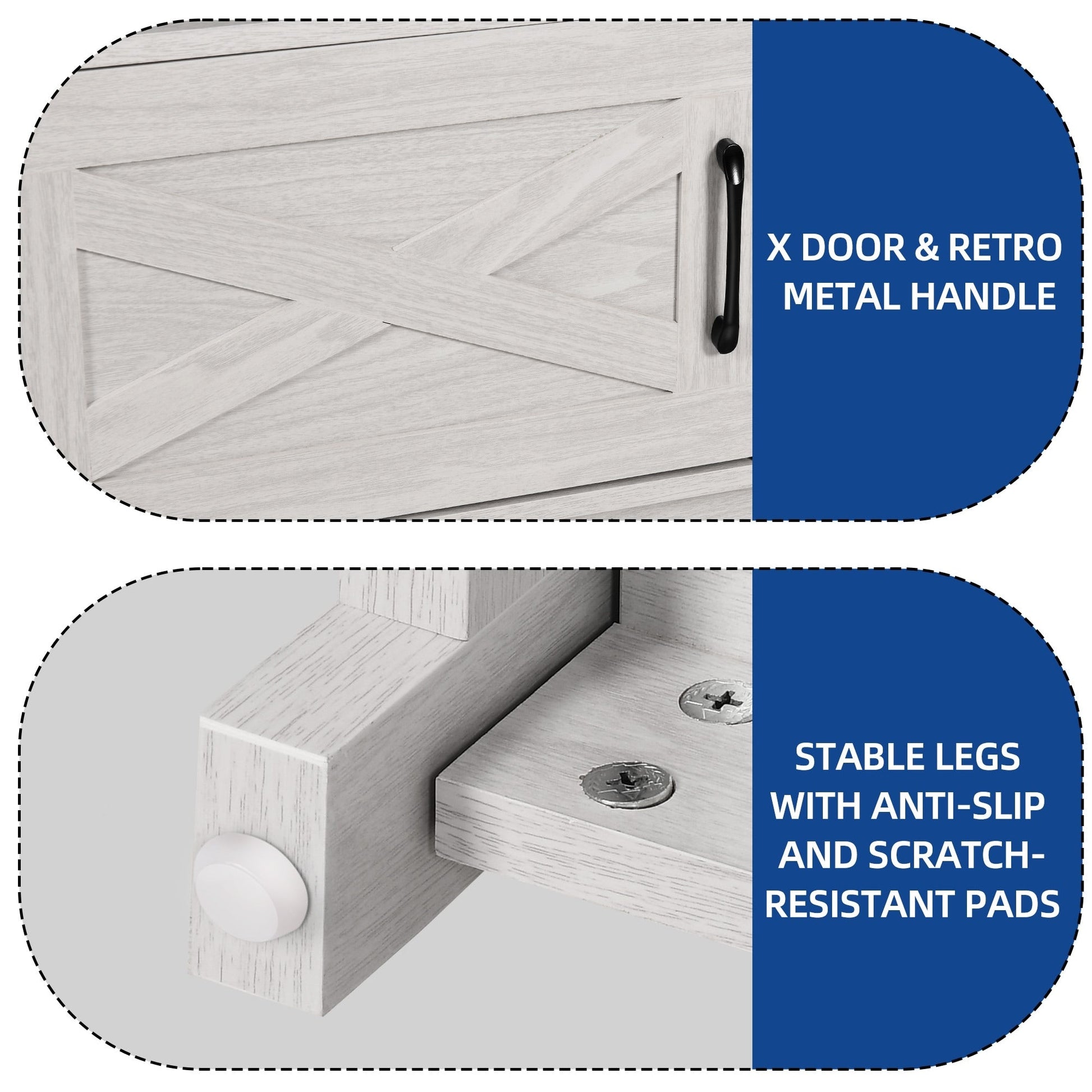- 1. Double X Design: Classic X design on both sides upgraded the decoration style. Easy steel bar handles hinge doors put things in and out conveniently without wobbling or scraping