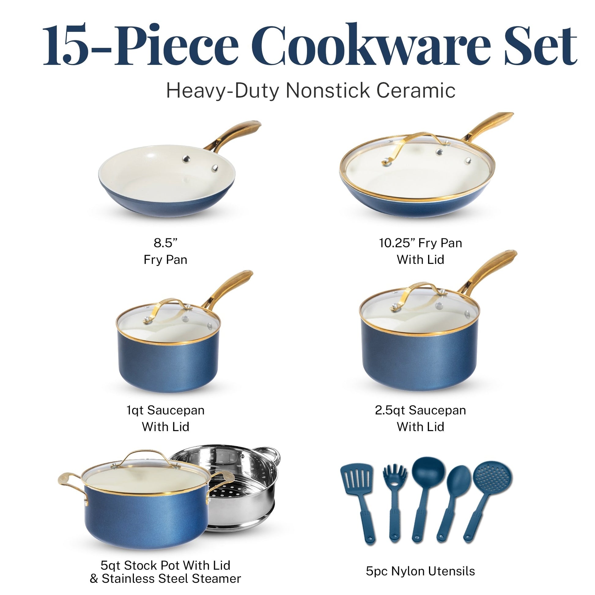 Gotham Steel Natural Collection Pots and Pans 15 Pc Ultra Performance Ceramic Nonstick Cookware Set in Navy