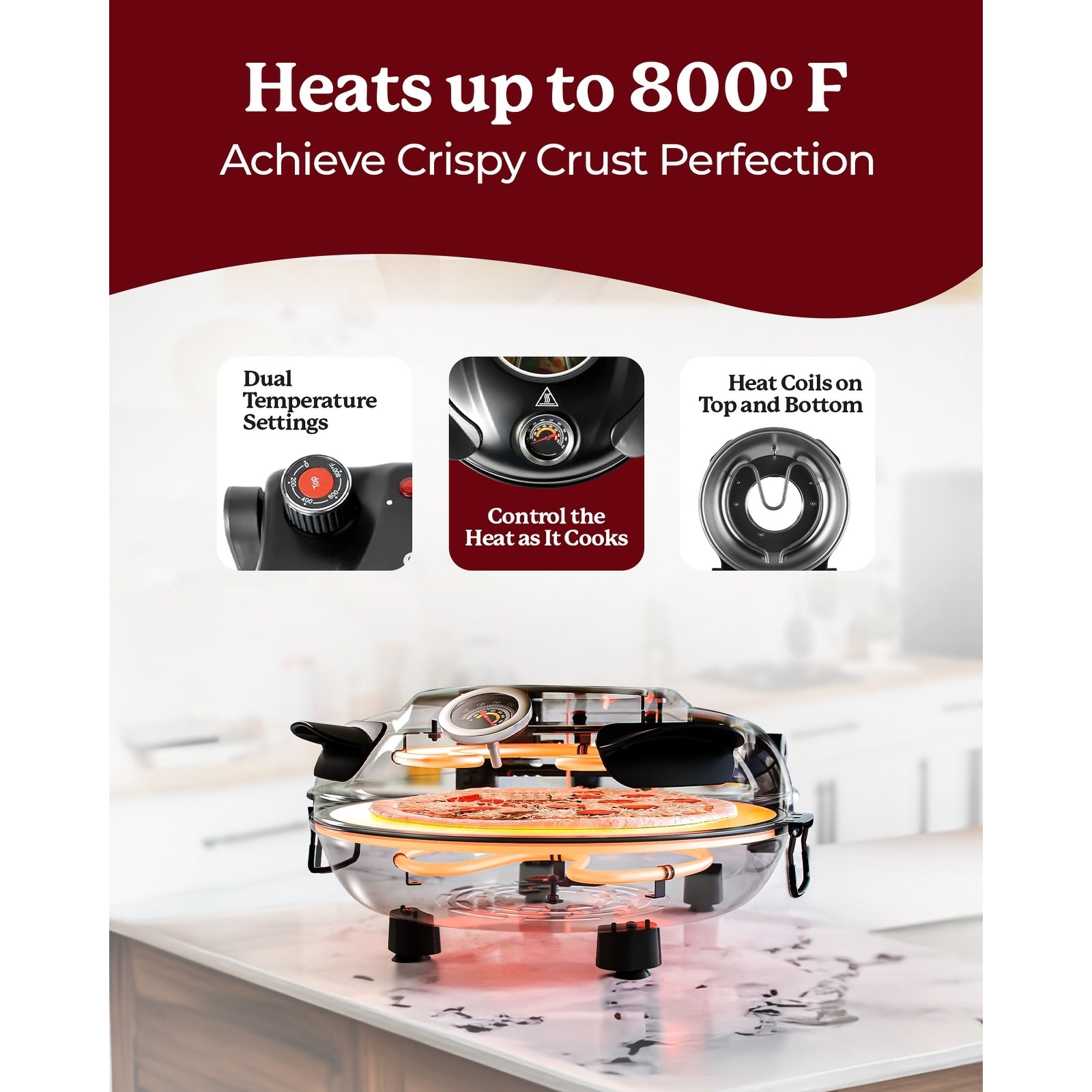 - Perfect Pizza Every Time: Achieve restaurant-quality pizzas with ease. The 12' ceramic stone delivers a crispy, golden crust, while the dual temperature control allows for precise baking from top to bottom. Cook your pizza in under 6 minutes at temperatures up to 800°F.