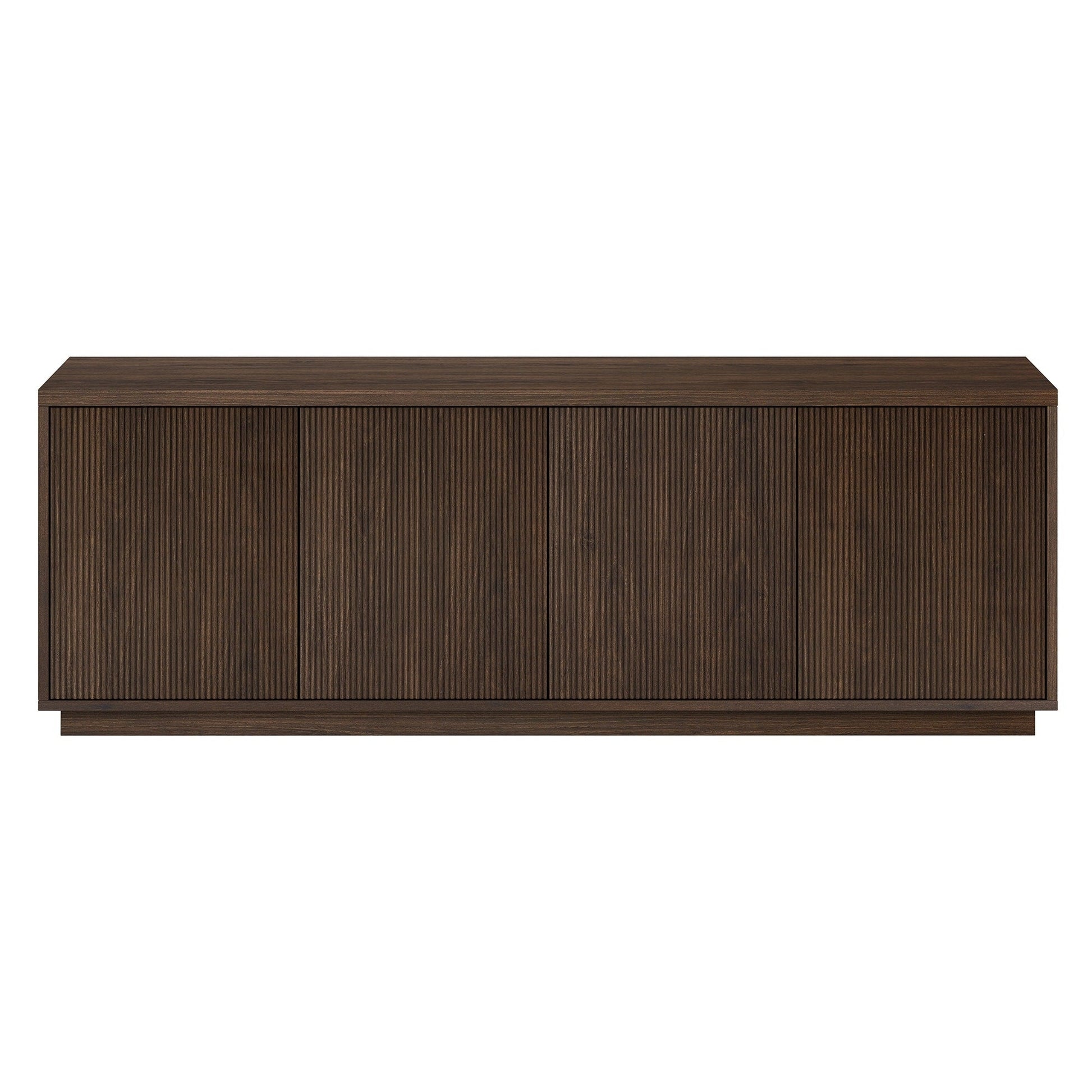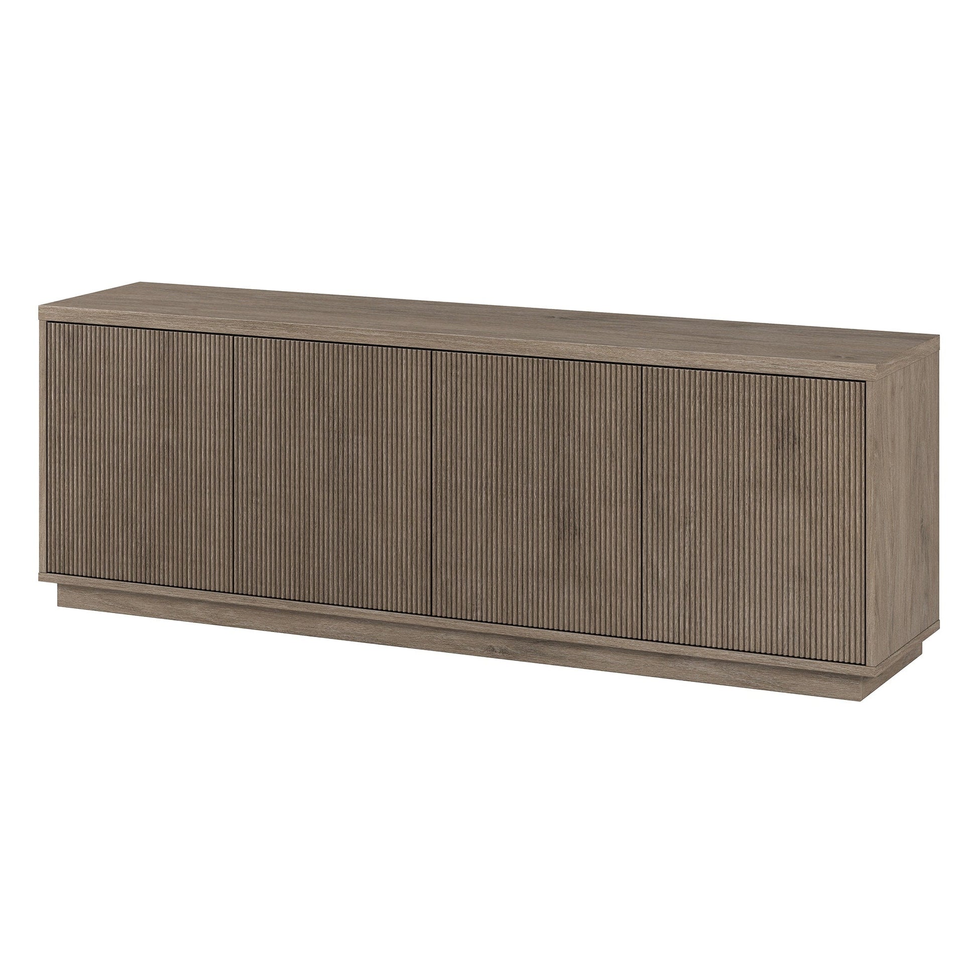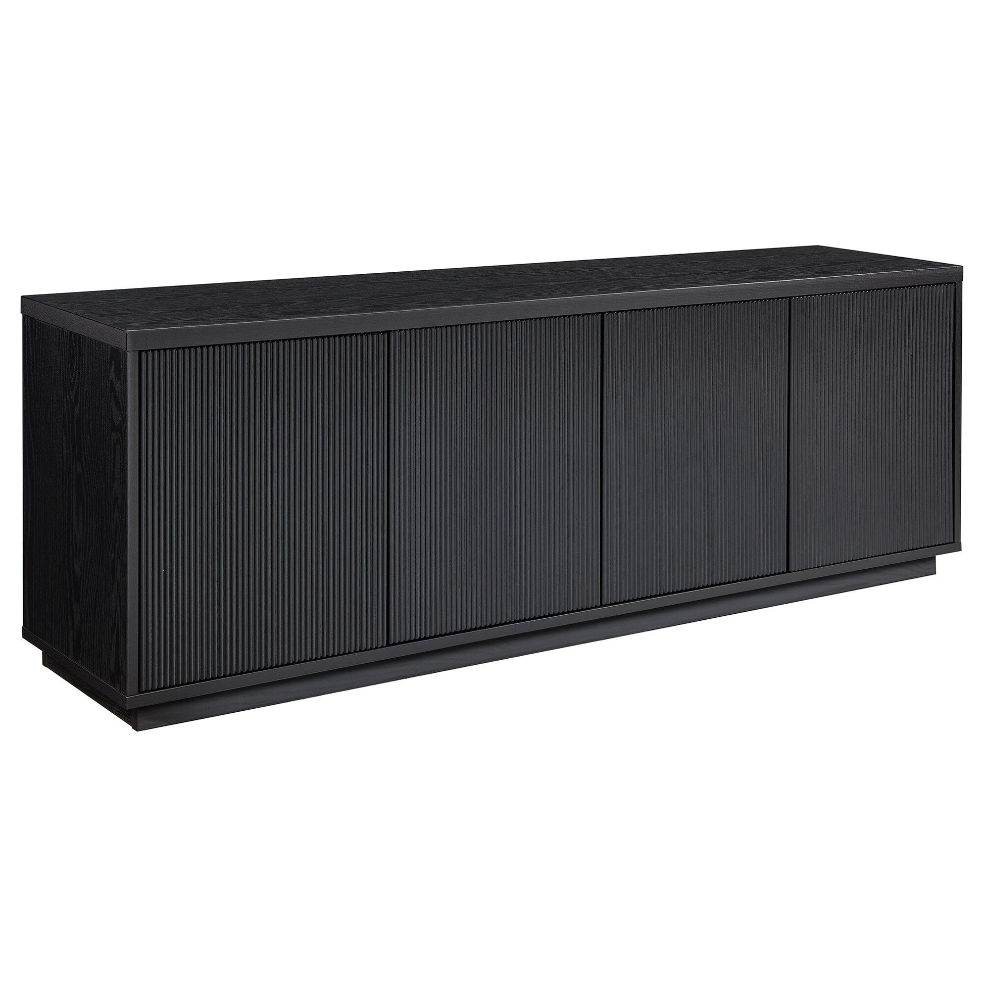 On-trend texture and design combine in this transitional TV stand. With a wood grain finish and textured doors, this piece is sure to be a statement in your living room, den, or game room. The plinth base gives an illusion of a seamless transition from your floor, as if it was always meant to be there. The modern contemporary design of the stand features 4 fully enclosed doors with 4 inner shelves, allowing for ample storage for your devices, games, books, and more.