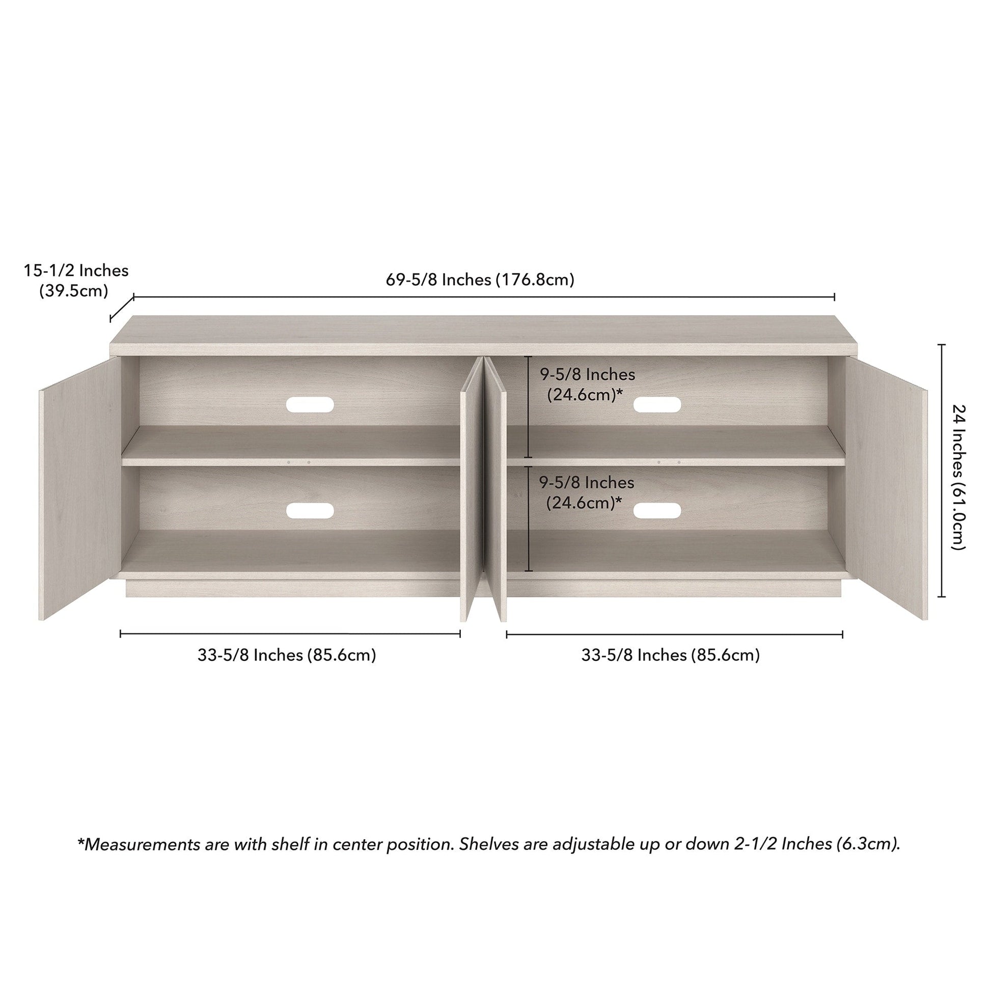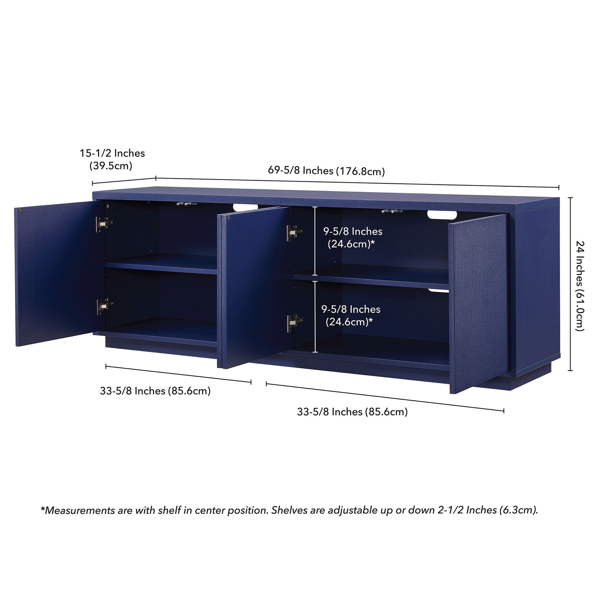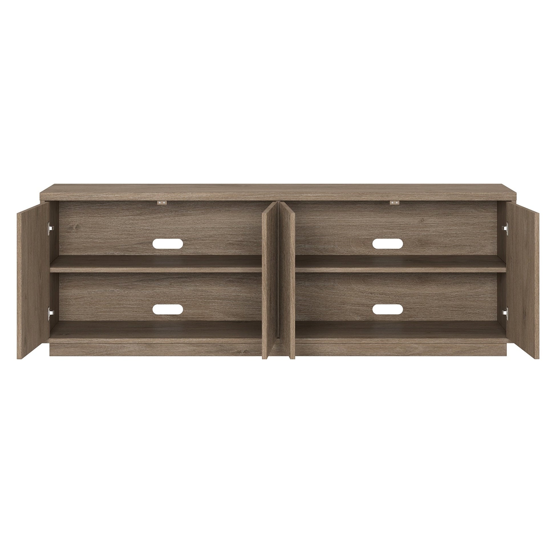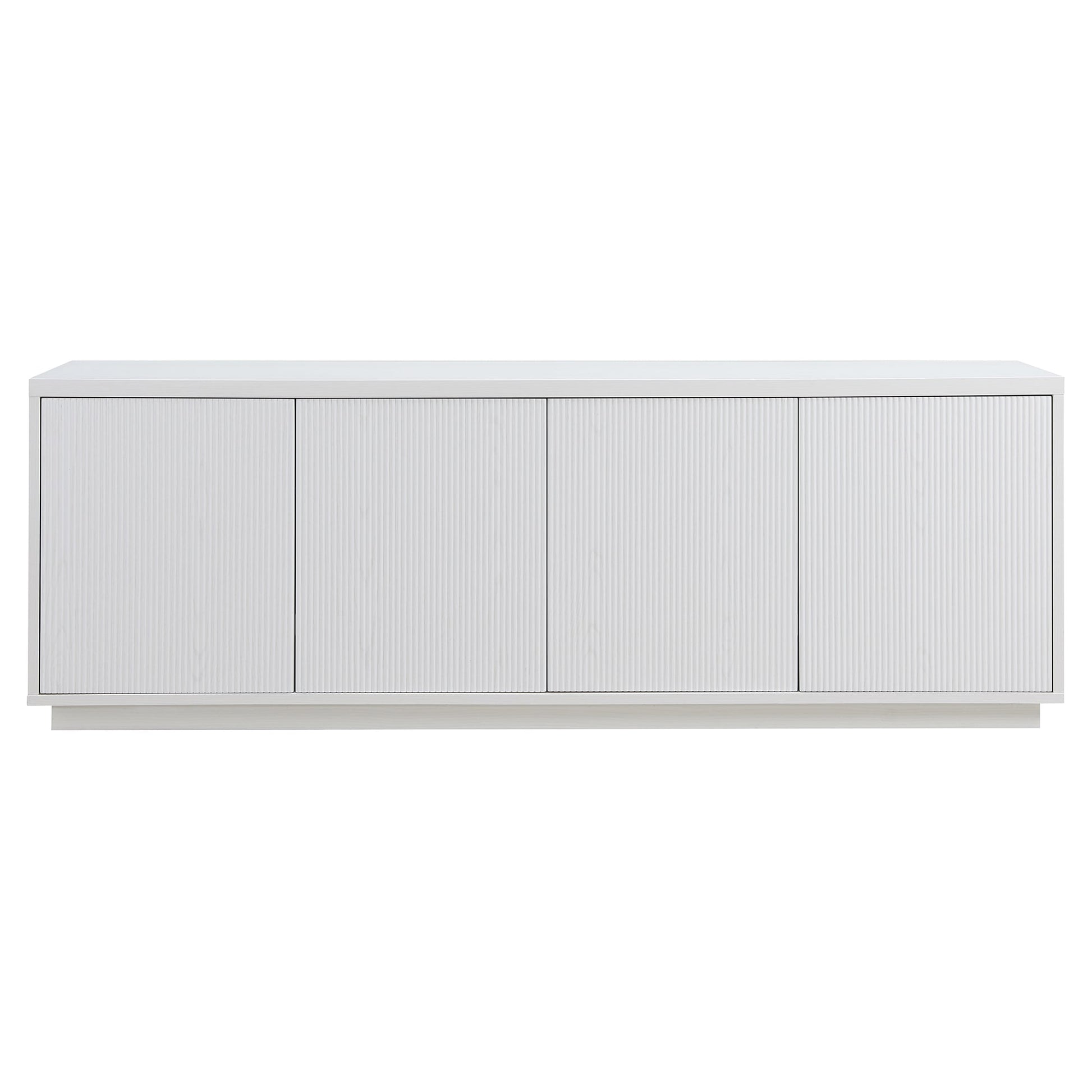 On-trend texture and design combine in this transitional TV stand. With a wood grain finish and textured doors, this piece is sure to be a statement in your living room, den, or game room. The plinth base gives an illusion of a seamless transition from your floor, as if it was always meant to be there. The modern contemporary design of the stand features 4 fully enclosed doors with 4 inner shelves, allowing for ample storage for your devices, games, books, and more.
