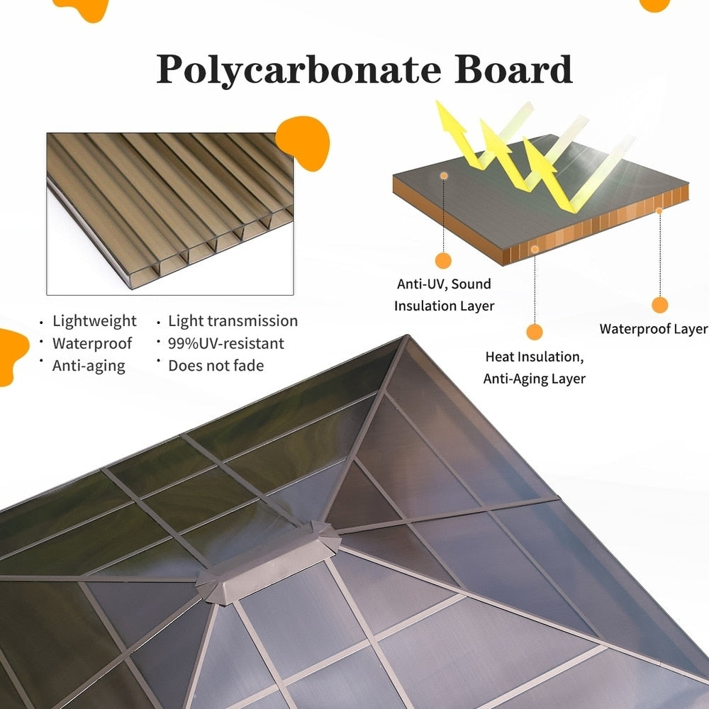 Crafted with premium-grade aluminum alloy as the primary frame material, this gazebo achieves an optimal balance between weight and load-bearing capacity. Its meticulously engineered frame structure ensures overall stability while significantly simplifying the assembly process. The aluminum material boasts exceptional corrosion resistance, maintaining its pristine appearance even with prolonged exposure to humid environments. Manufactured using fully recyclable eco-friendly materials with substantially reduced energy consumption during production, it allows your outdoor leisure activities to align with sustainable environmental principles.