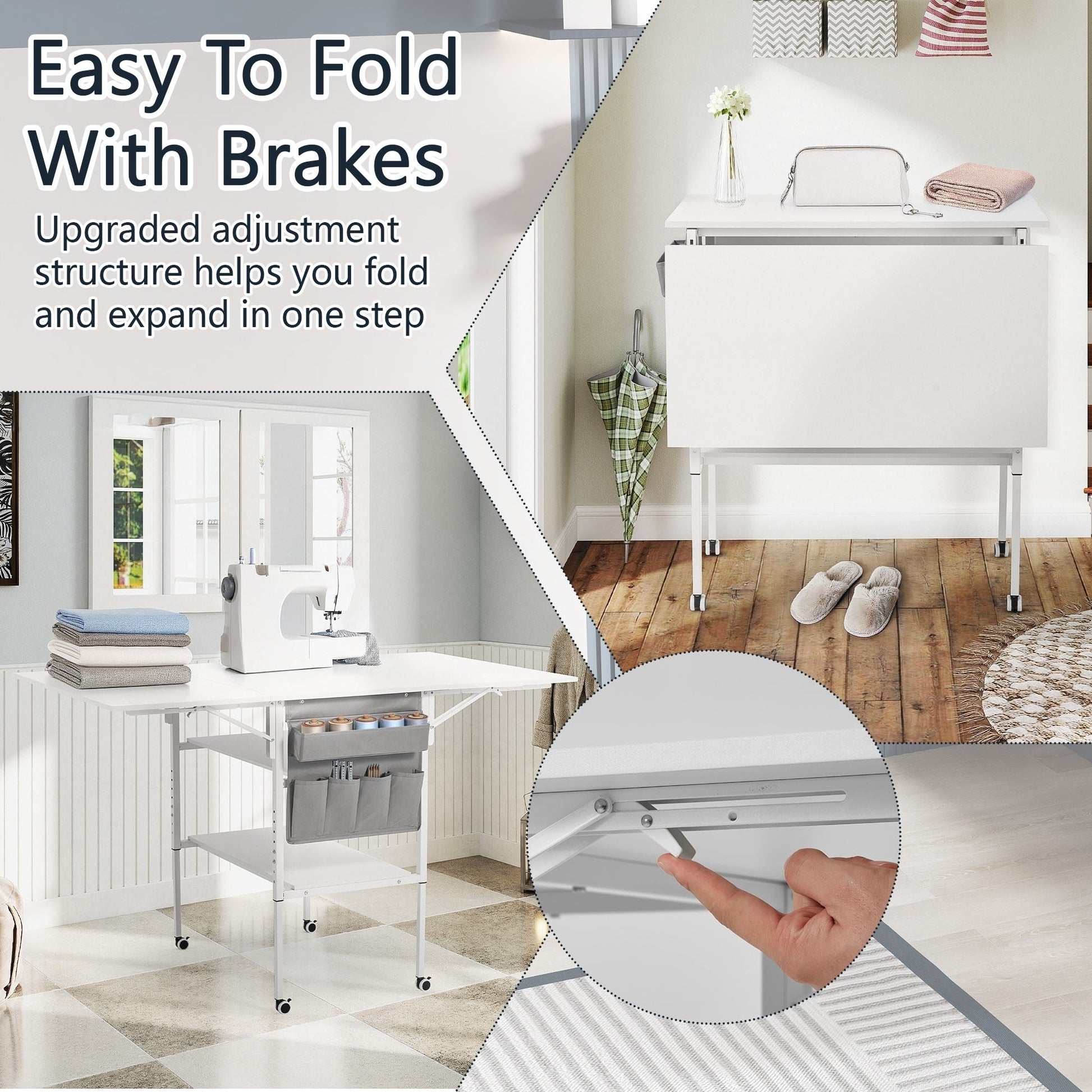 The unique folding design offers versatility for all your needs. When unfolded, it’s a fully functional sewing table or home office desk. Folded up, it transforms into a side or display table, providing extra space to store and showcase items.