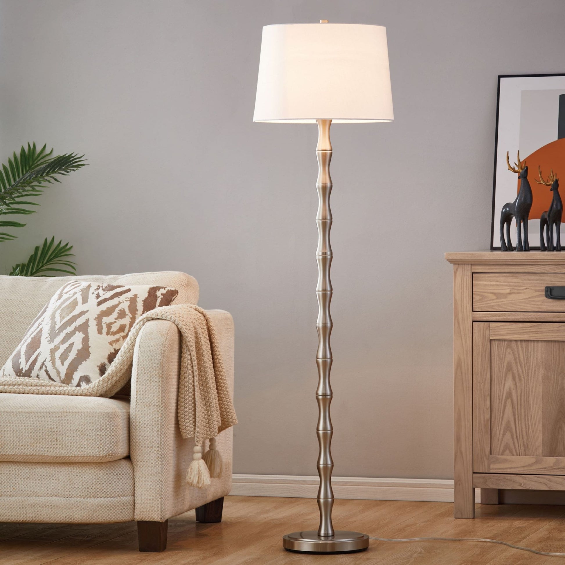 With the clean lines and sleek metallic accents, this floor lamp lends your layout a touch of contemporary style. Crafted from metal, it features a slender body that blends with most color palettes. Up above, a fabric drum shade rounds out the design, diffusing light from a compatible Max 150W medium-base bulb (bulb not included) in an ambient direction.