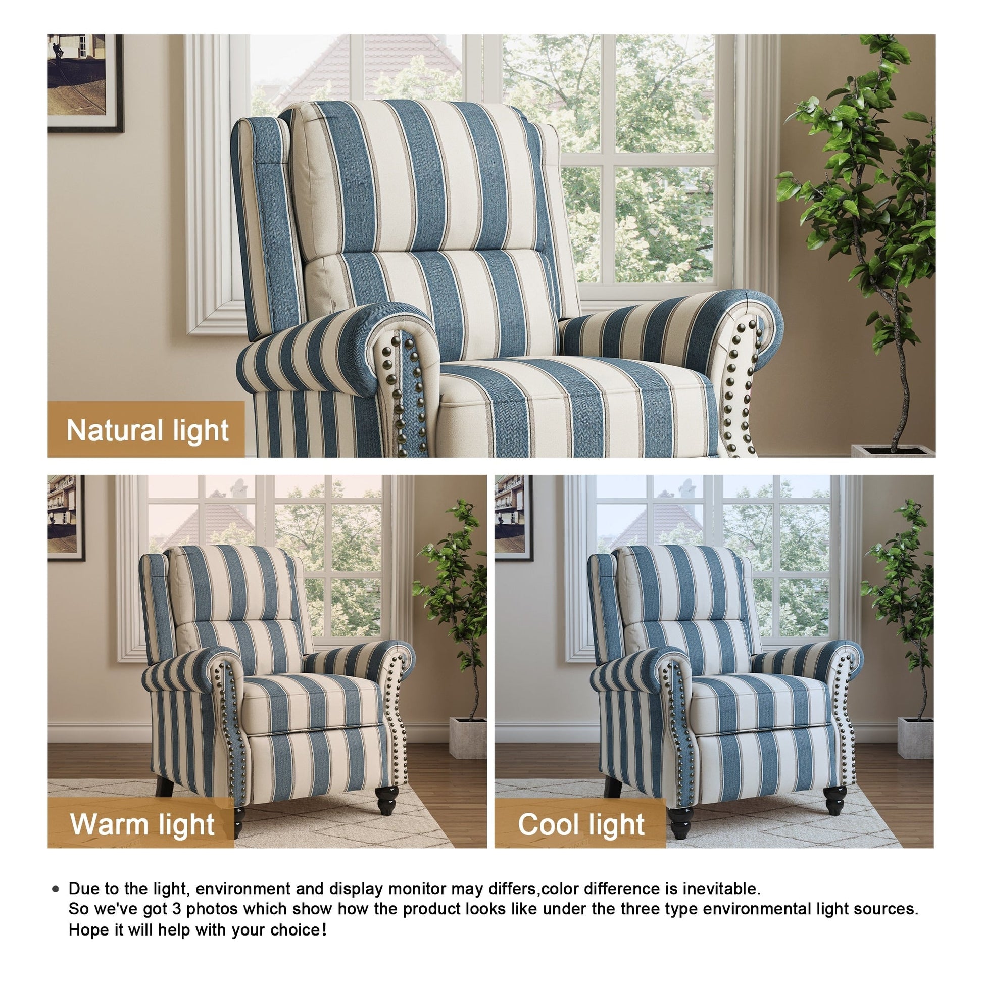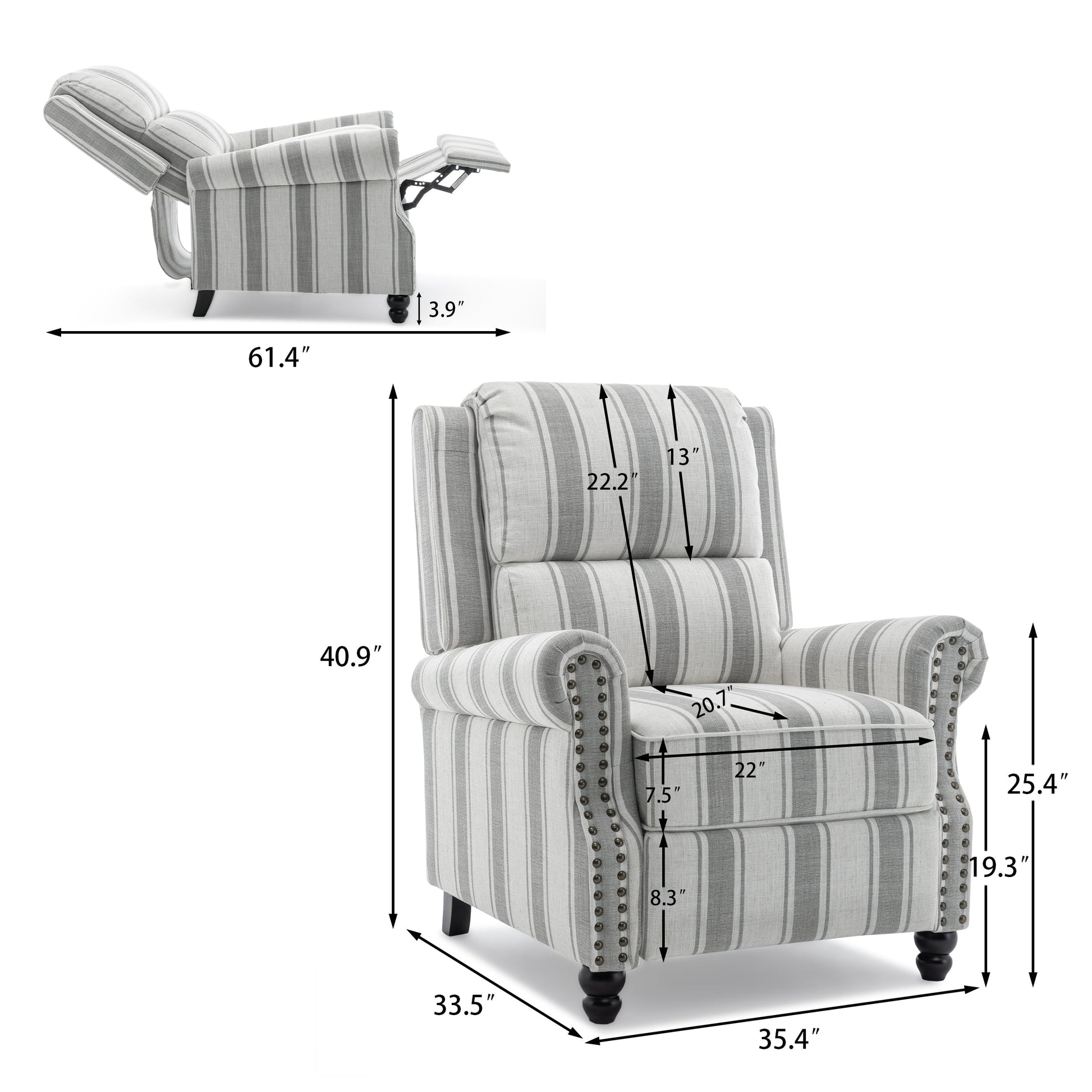 Upgrade your relaxation space with this sleek and versatile recliner chair, designed to provide both style and comfort. The smooth reclining mechanism by body and foot perfect control, allows you to effortlessly find your perfect position for total relaxation. Padded with high-density foam in the headrest, lumbar, backrest, and armrests, it provides full-body support and relieves pressure while you unwind. Whether you're watching TV, reading, or napping, this recliner offers the ideal balance of comfort and style. Two premium options to choose from, smooth PU leather for a modern, easy-to-clean finish, or cozy linen fabric with floral or striped patterns adding a cozy, decorative touch, perfect for a more vibrant or traditional aesthetic. With nailhead trim and various color/pattern choices, it easily complements any living room, office, or study, making it both a functional seating solution and a stylish statement piece for your home.