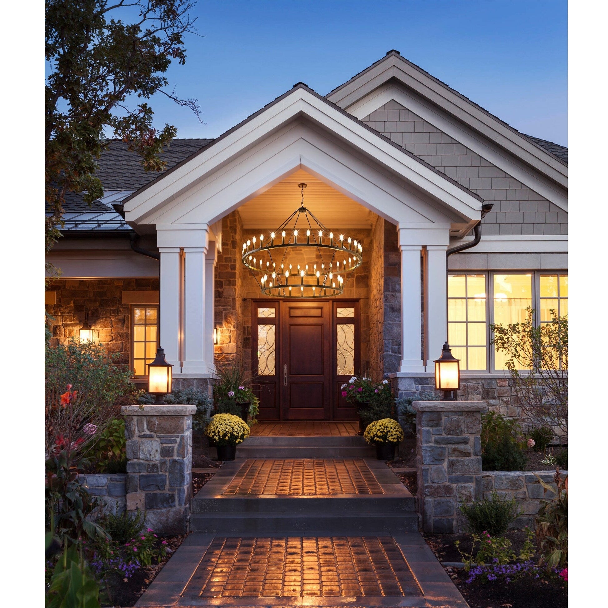 Add a touch of modern farmhouse style to your home with this Modern Farmhouse Chandelier 2 Tier Round Wagon Wheel Chandelier Large High Ceiling Light. This classic chandelier made of hight quality iron, powder-blasted for a matte finish, it is durable. 2 tier total 36 lights provides 360° light coverage, creates a cozy home atmosphere, this large chandelier is perfect for fully illuminating a large space like living room, dining room, and large two story foyer/entryway.