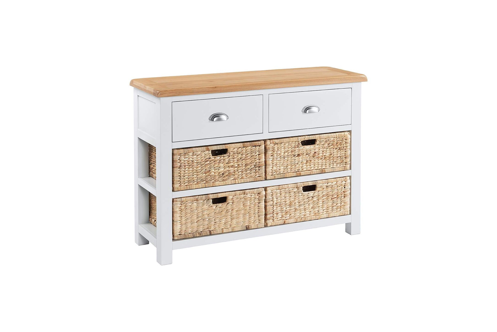 Cette base dispose de diverses options de rangement avec des paniers et des tiroirs.