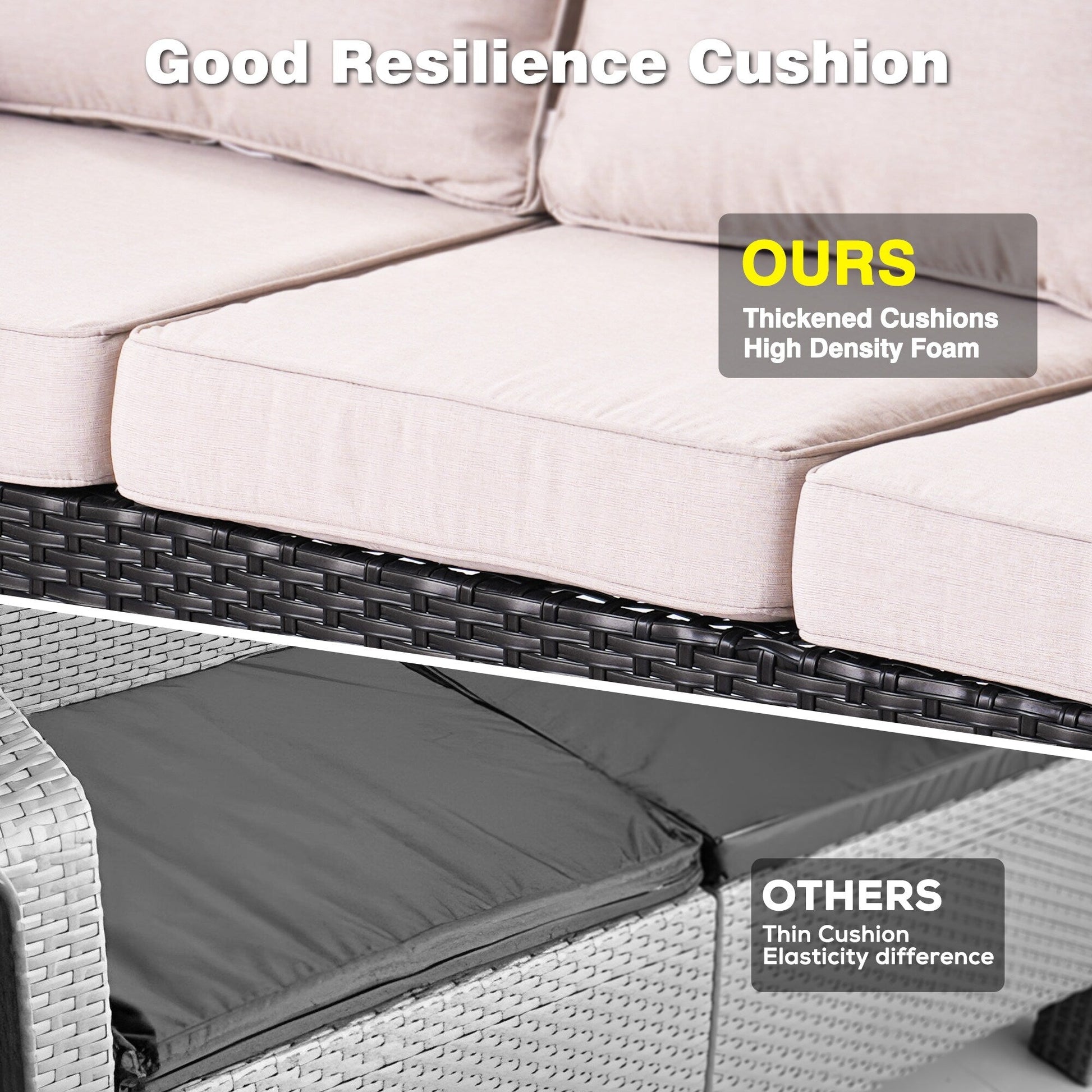Create an outdoor oasis with the OVIOS 5-piece Patio Conversation Wicker Furniture Set. This set includes two armchairs, one sofa, and two ottomans, all crafted with commercial-grade, all-weather PE rattan for long-lasting durability. The thick sponge seat cushions offer comfort and relaxation, while the high backrests and curved armrests provide ergonomic support. With waterproof covers that are easy to clean, this set is perfect for any patio, porch, poolside, or garden. Choose from multiple colors to match your style and elevate your outdoor space.