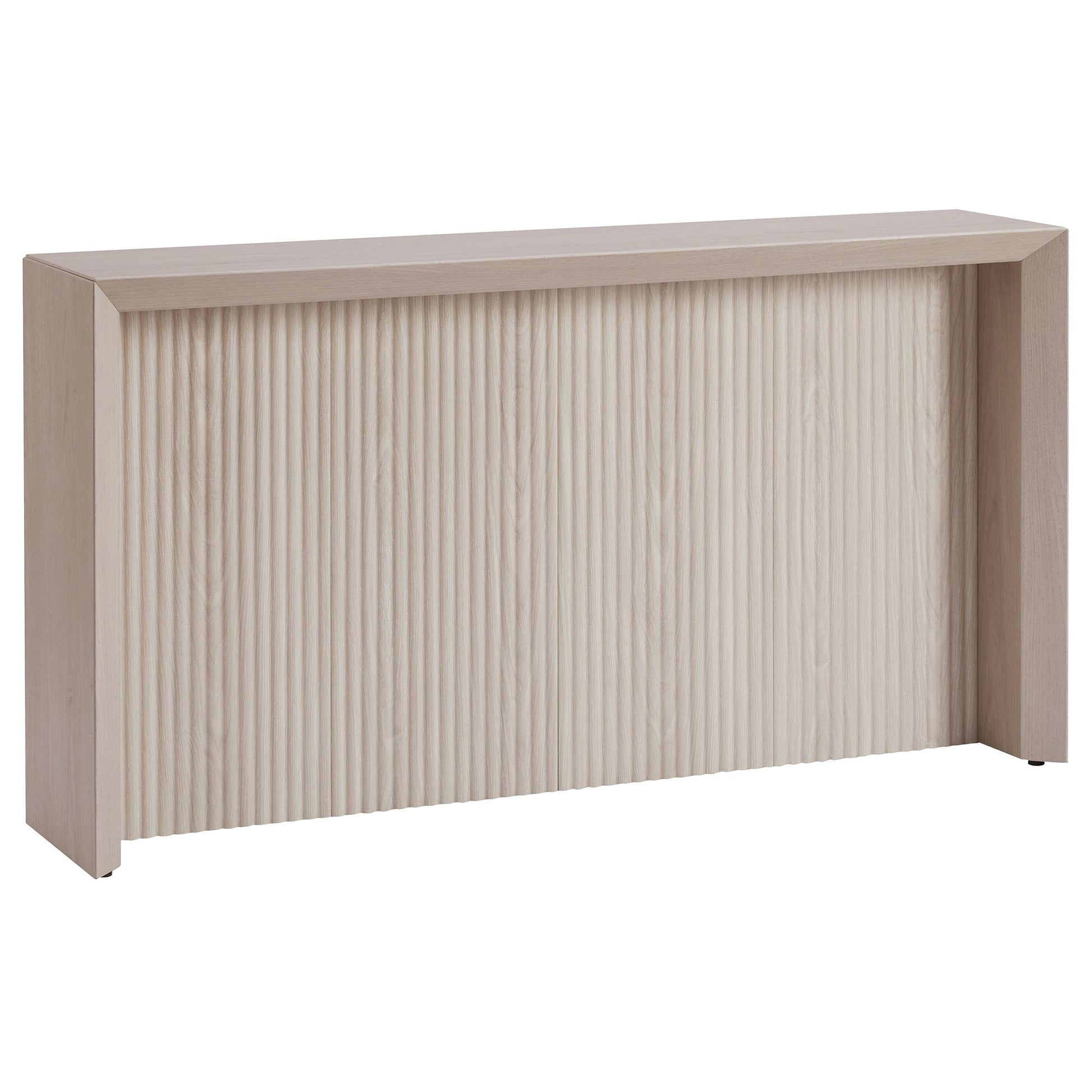 Striking in its simplicity, this modern console table emphasizes clean lines and straightforward design. The table's seamless design is given extra dimension with the beveled banding around the edges, while the fluted recessed backer creates a textured backdrop. The natural wood-look finish adds on-trend tonal variation to your space. With easy assembly, this is the perfect piece to effortlessly update your living room, family room, or office.