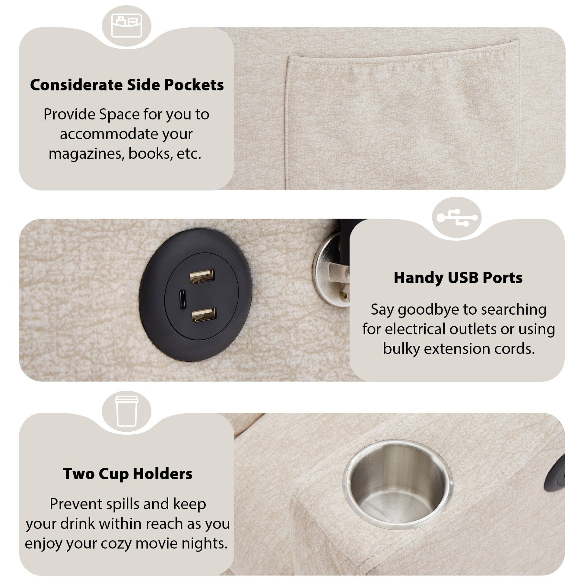 - Convenient Features: Includes 3 USB ports for easy charging, 2 side pockets for storage, and 2 built-in cup holders to keep drinks within reach without spills.