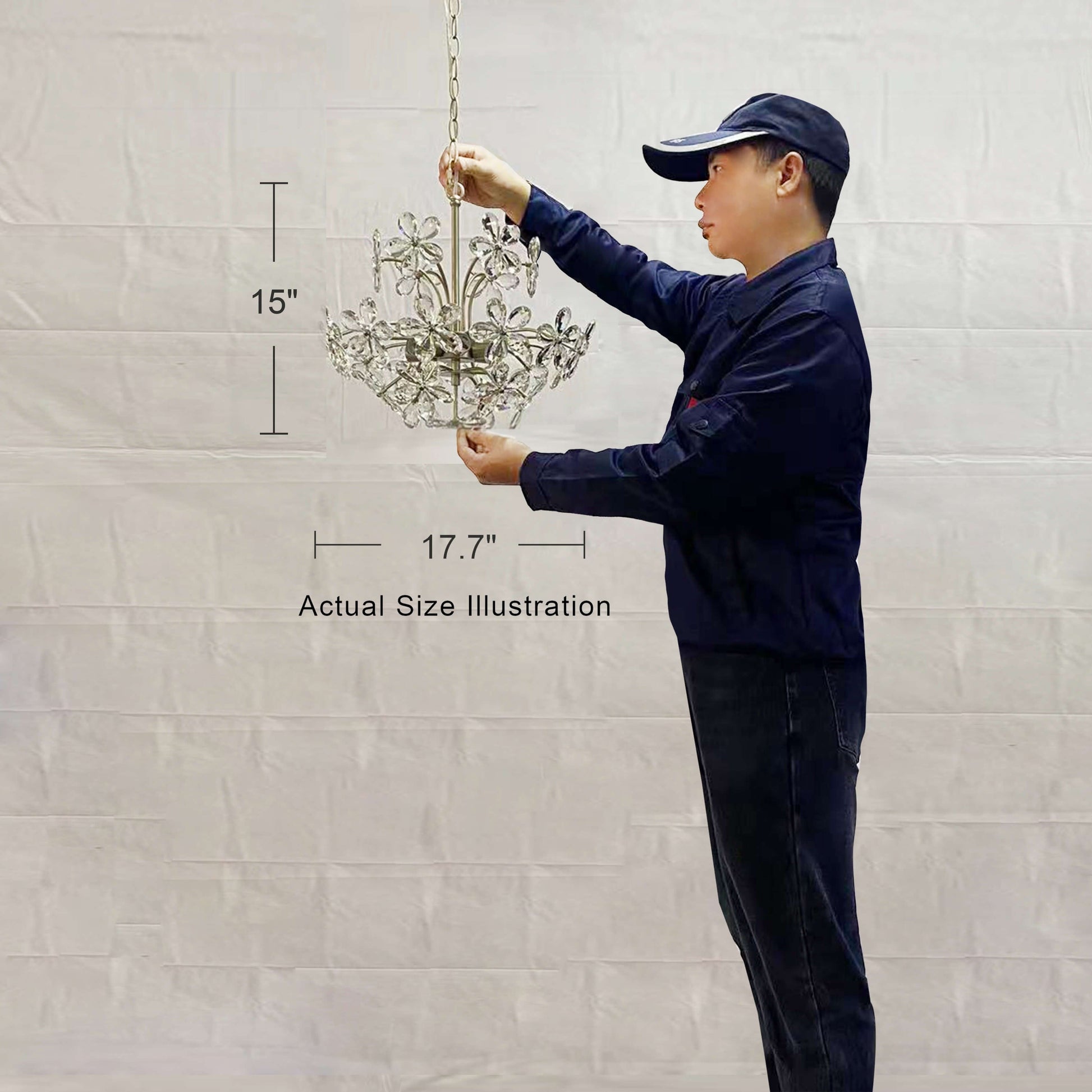 - Fixture: 17.7 inches in diameter x 15 inches H; Ceiling plate: 5.1 inches in diameter x 1 inch H.