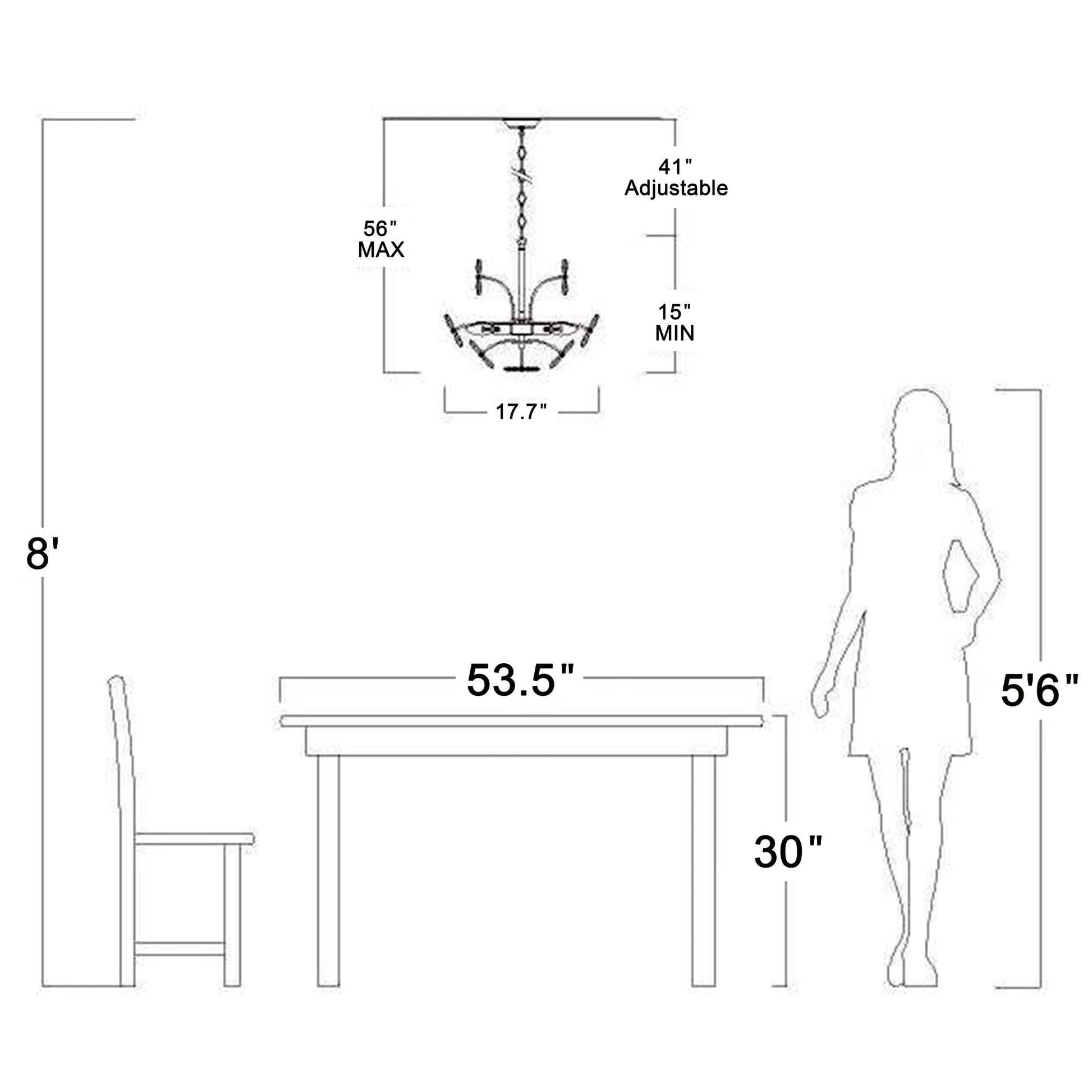 - Max hanging height (from ceiling to the bottom of the light fixture): 56 inches, which can be shortened.