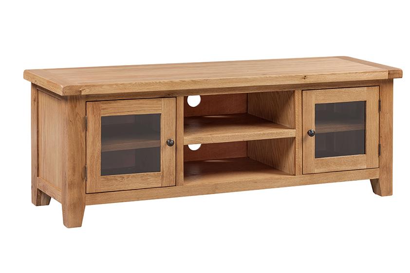 Un grand meuble pour un grand téléviseur ! Ce meuble offre un espace généreux. Deux portes vitrées et un espace généreux pour vos accessoires multimédia. Cette gamme solide, imposante et traditionnelle est livrée entièrement assemblée dans une finition chêne moyen avec des angles arrondis et de jolies poignées de porte en métal.