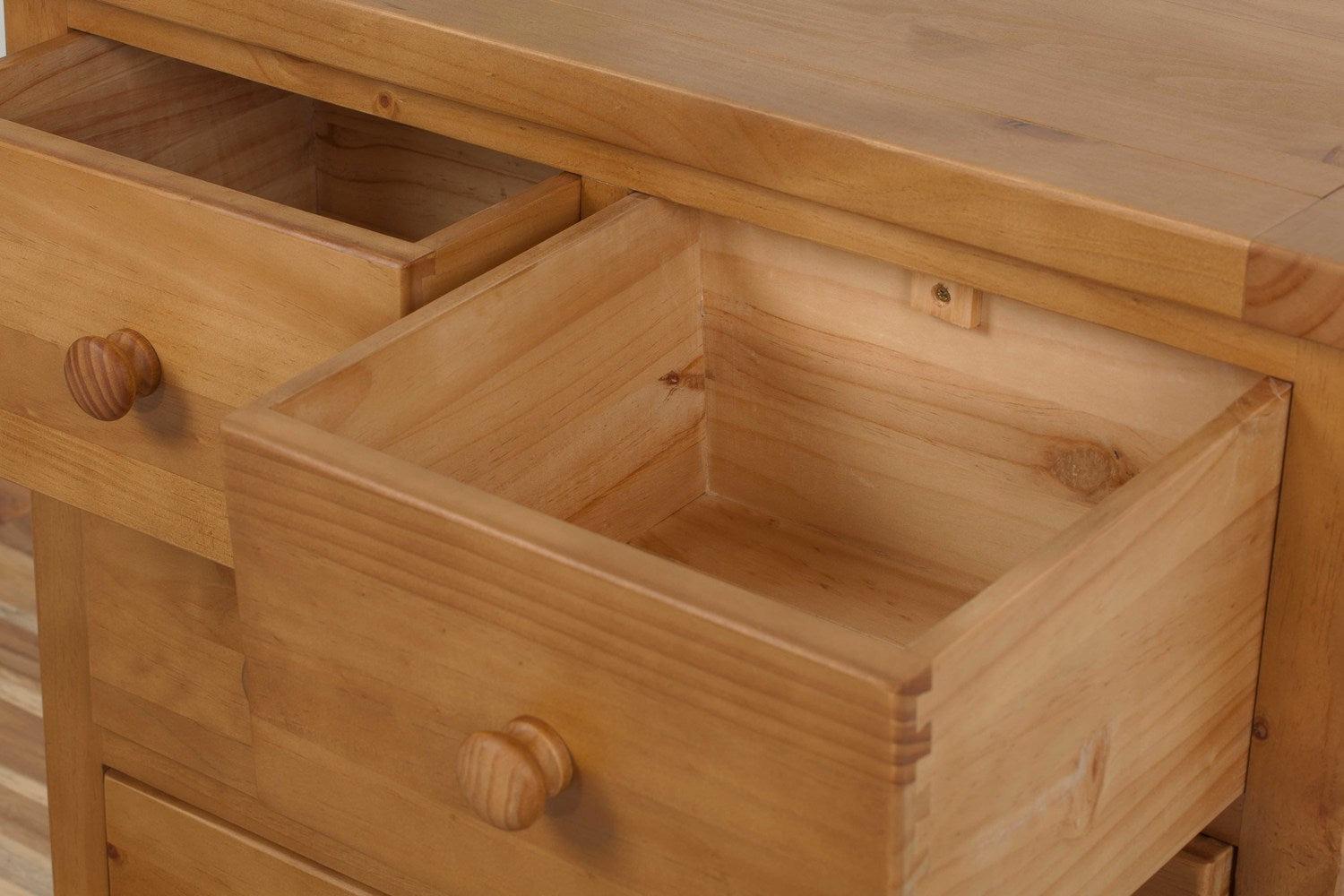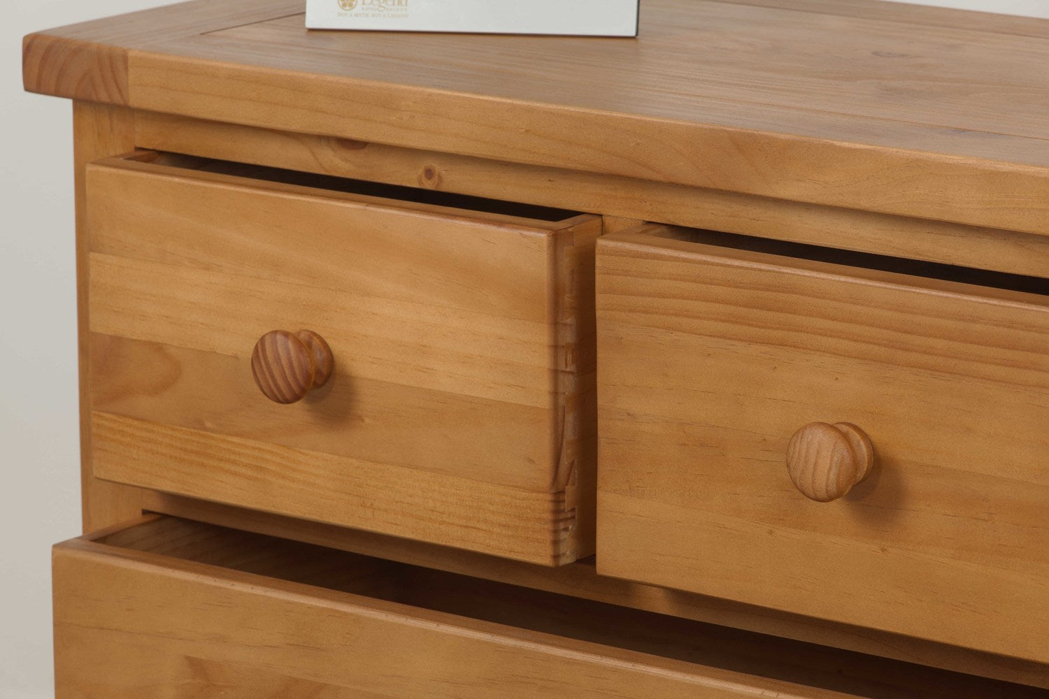 Cette commode à 4 tiroirs de notre gamme Rutland est très abordable tout en conservant une impression de qualité. Fabriquée avec soin grâce à des assemblages à queue d'aronde, elle est conçue pour durer. Elle sublimera n'importe quelle chambre et s'harmonisera parfaitement avec d'autres meubles de la même gamme. Magnifiquement réalisée en pin massif 100 % pin, la commode Rutland, grâce à sa finition soignée, est garantie de conserver sa beauté et de durer de nombreuses années grâce à sa robustesse et sa finition haut de gamme. Chaque commode est soigneusement traitée avec une couche de cire de pin de qualité supérieure, qui scelle le bois et le protège des bosses et des taches. Elle sublime et met en valeur la beauté naturelle du grain du bois, créant ainsi l'effet chaleureux et riche illustré.