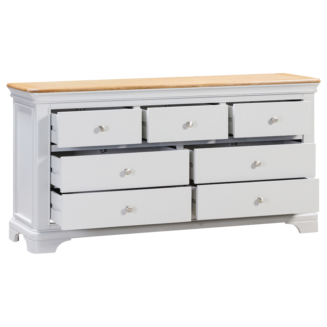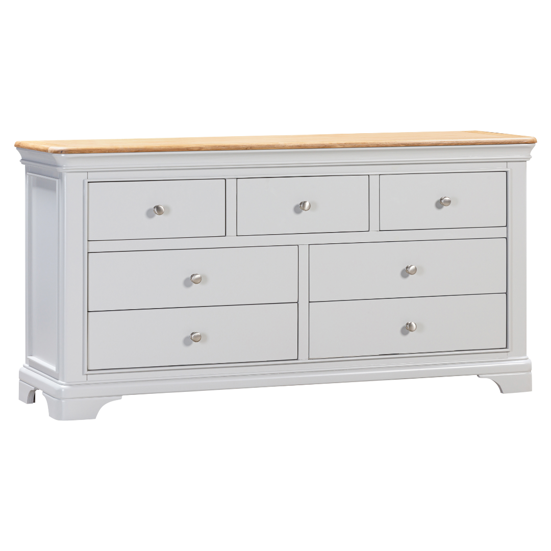 Notre nouvelle gamme « Savoie » est disponible en deux coloris : gris tourterelle (illustré) ou gris anthracite (illustré), avec un plateau en chêne huilé. Elle est équipée de quatre grands tiroirs et de trois tiroirs moyens pour ranger vos vêtements, petits ou grands. Livrée avec des boutons en chrome brossé et en bois. Livrée entièrement assemblée.
