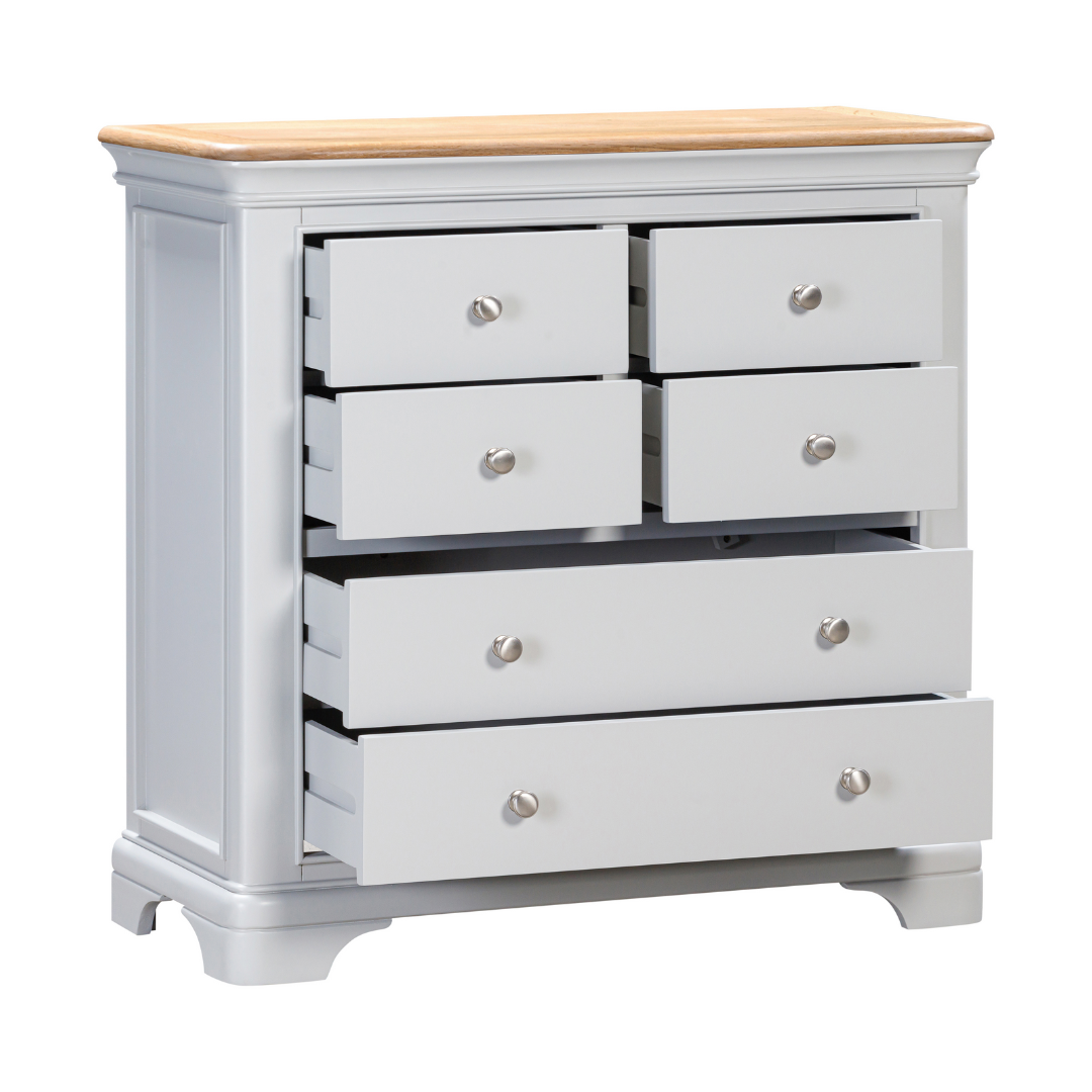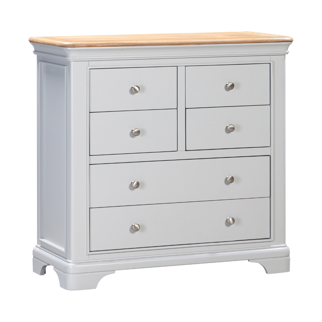 Notre nouvelle gamme « Savoie » est disponible en deux couleurs « Gris tourterelle » illustré ou « Gris anthracite » avec un plateau en chêne huilé. Cette commode au look traditionnel avec une touche contemporaine est livrée avec 2 grands et 4 petits tiroirs fournis avec des boutons en chrome brossé et en bois, et est livrée entièrement assemblée.