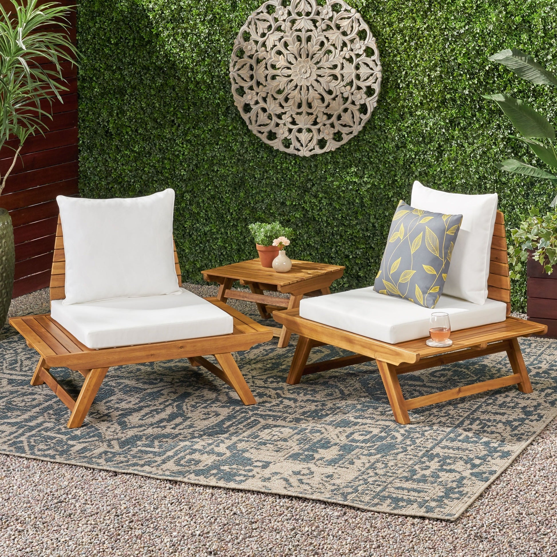 Enjoy your outdoor patio area with this set of two acacia wood chairs from the Christopher Knight Home collection. The slatted acacia wood frame features an extra-wide seat that extends past the seat cushion, forming a convenient built-in table. The water-resistant polyester cushions are removable to provide easy care.
