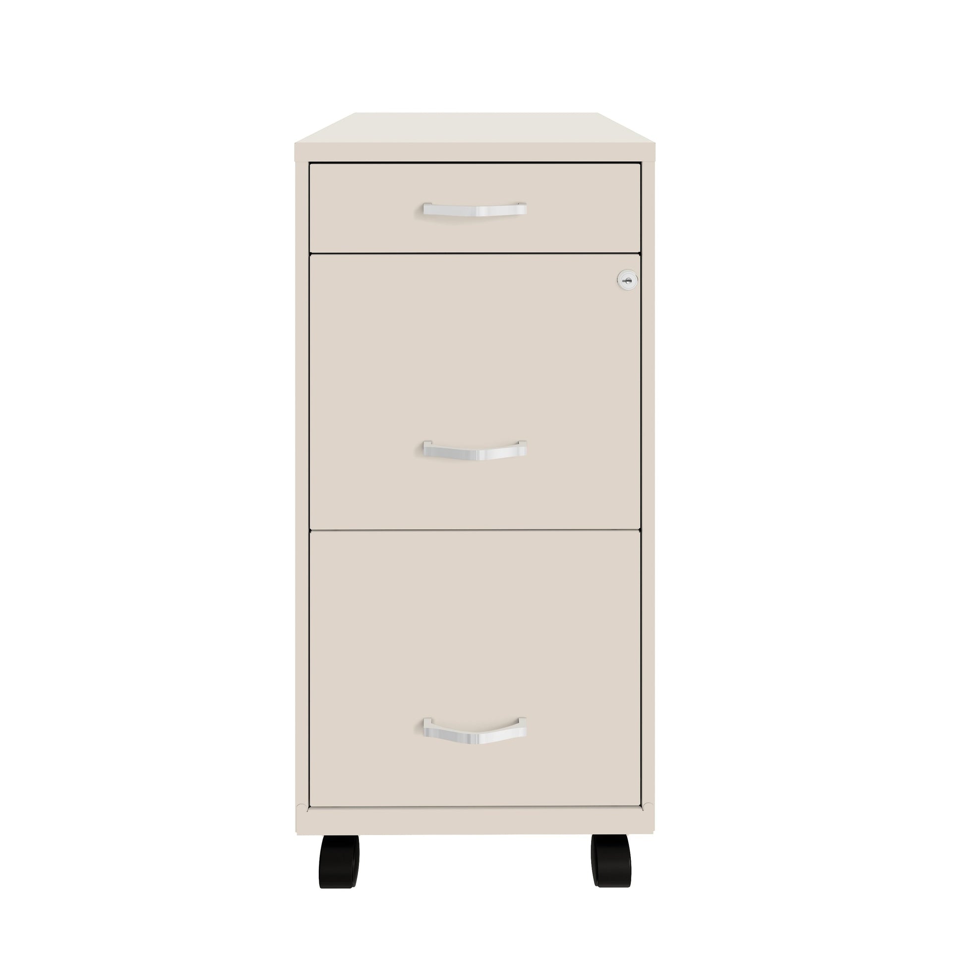 The 3-Drawer Organizer Metal File Cabinet is a multifunctional file cabinet perfect for storing files, supplies, and accessories for your small office or home office. Featuring two file drawers and an additional small storage drawer, this file cabinet features a smart, efficient design that works well in small spaces and fits under most work surfaces or desks. Each drawer features high-sides to accommodate letter-sized hanging files. The top pencil drawer is the perfect storage for other office essentials. The additional wheels that come with this file cabinet are both stylish and functional which makes it easy to move around your home or office. Using a patented glide suspension, the drawers have a smooth open and close slide with a three-quarter drawer extension to prevent tipping. In addition, you can keep your files and possessions secure by using the built-in lock for the top two drawers. Painted steel surface is non-porous and easy to clean . Bring organization and function to your home or office with this three-drawer file cabinet!