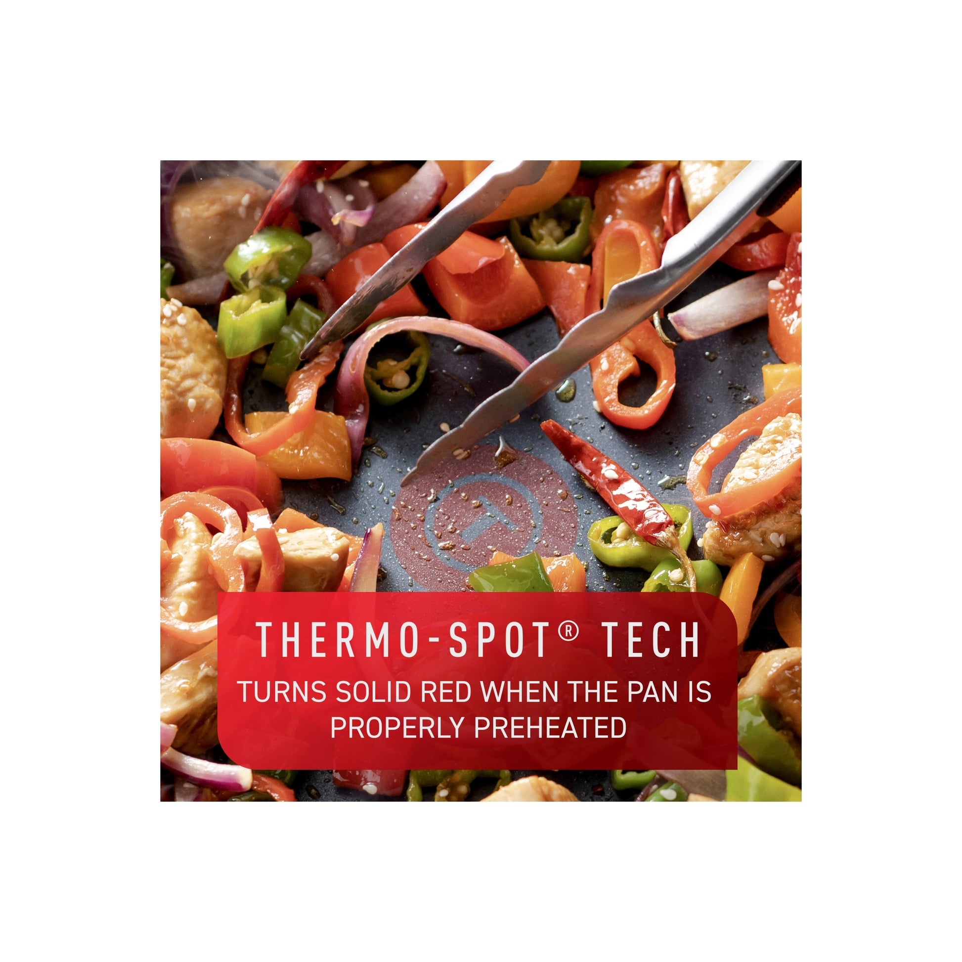 - Thermo-Spot turns solid red to indicate when the pan is properly preheated (only on frypans and sauté pans)