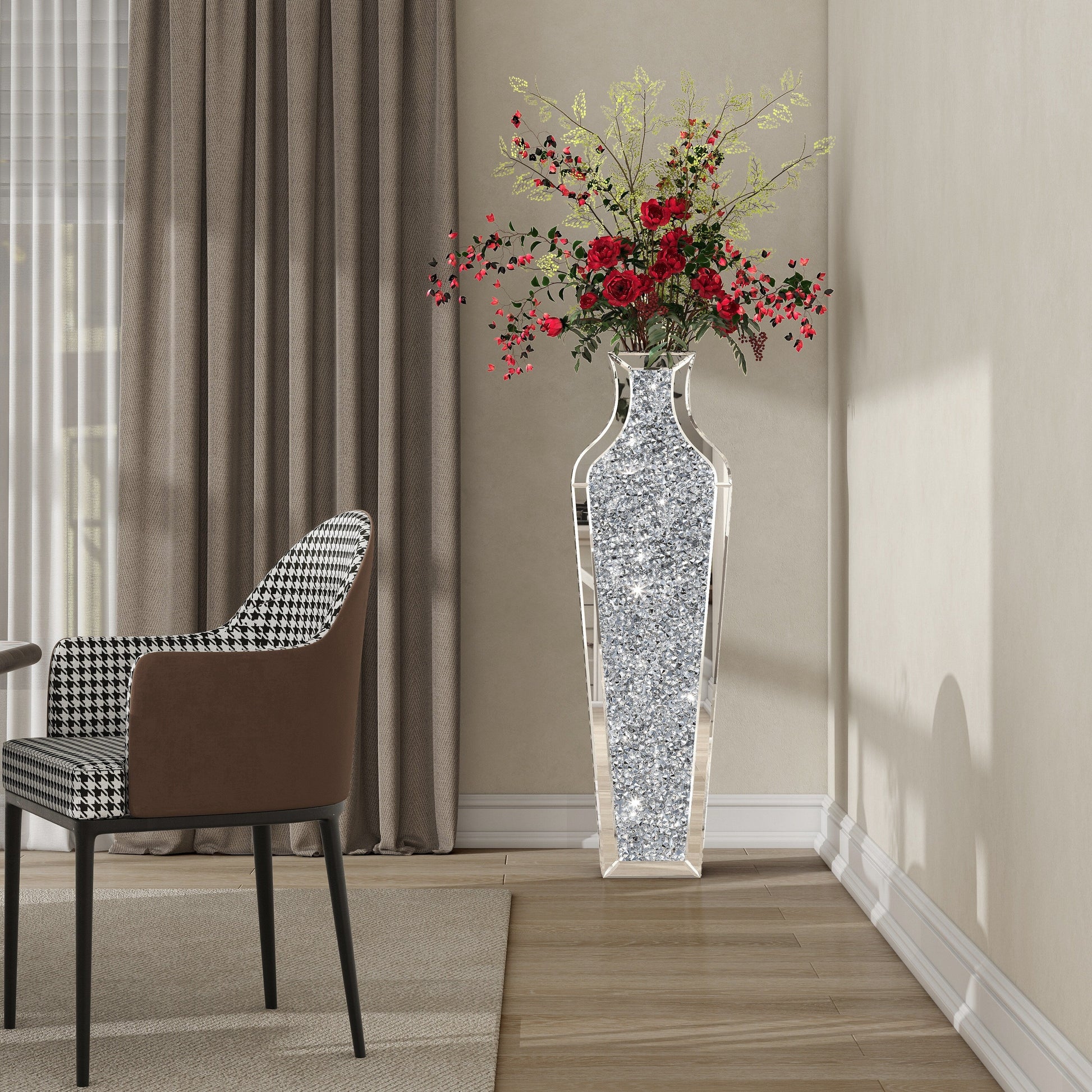 If you like to decorate your home, this floor vase will be your best choice, it can be well placed in any corner, especially at the entrance, next to the TV cabinet, in the middle of the sofa. Appreciate their design best against solid-colored backgrounds in elegant settings. They make great unique decor on mantle, console table or in any living space. Designed with mirror top and crushed diamond vase body. This floor vase decorative botanical and flowers to bring some bright and texture in your living space. Suitable for indoor use. Glam style. Vase has a 4.6 in mouth opening,26.8'/36'/43' silver mirror vase.
