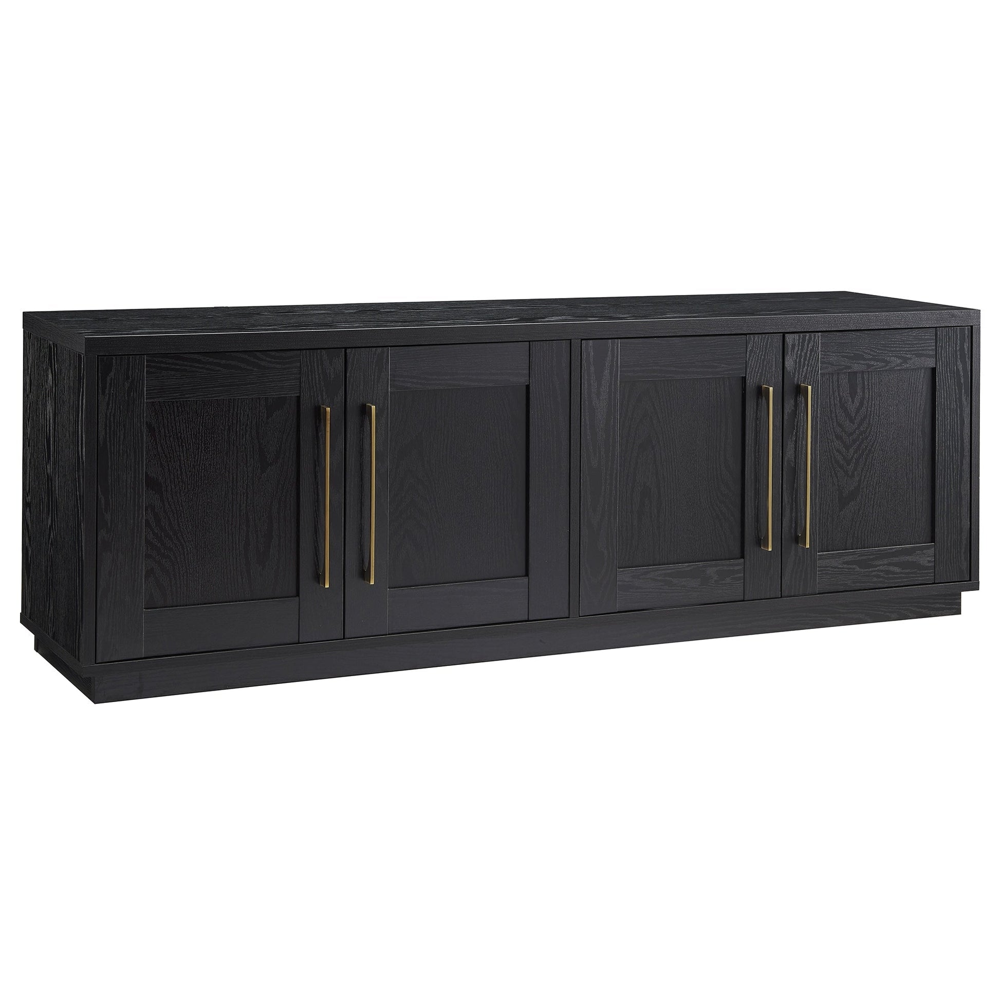 Combine functionality and classic transitional design with this modern TV stand. Its rich wood tone creates a warm neutral palette that will blend seamlessly into any color scheme, while its classic styling pairs perfectly with the existing design inspiration of your living room, den, or game room. This solid-backed stand features two large enclosed cabinets with sleek brass-finished hardware. Cable management cut-outs and adjustable inner shelves help keep your media storage and consoles organized.