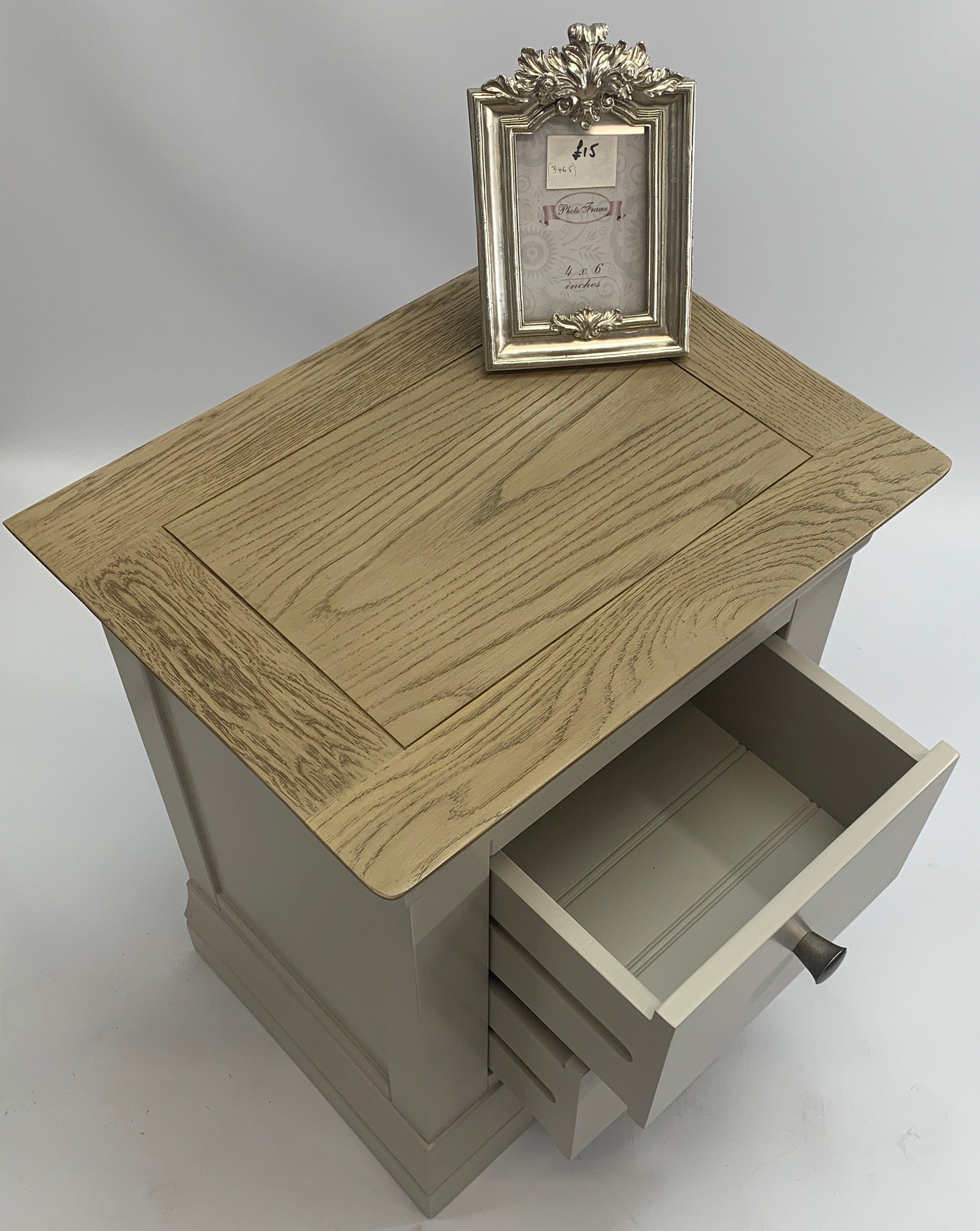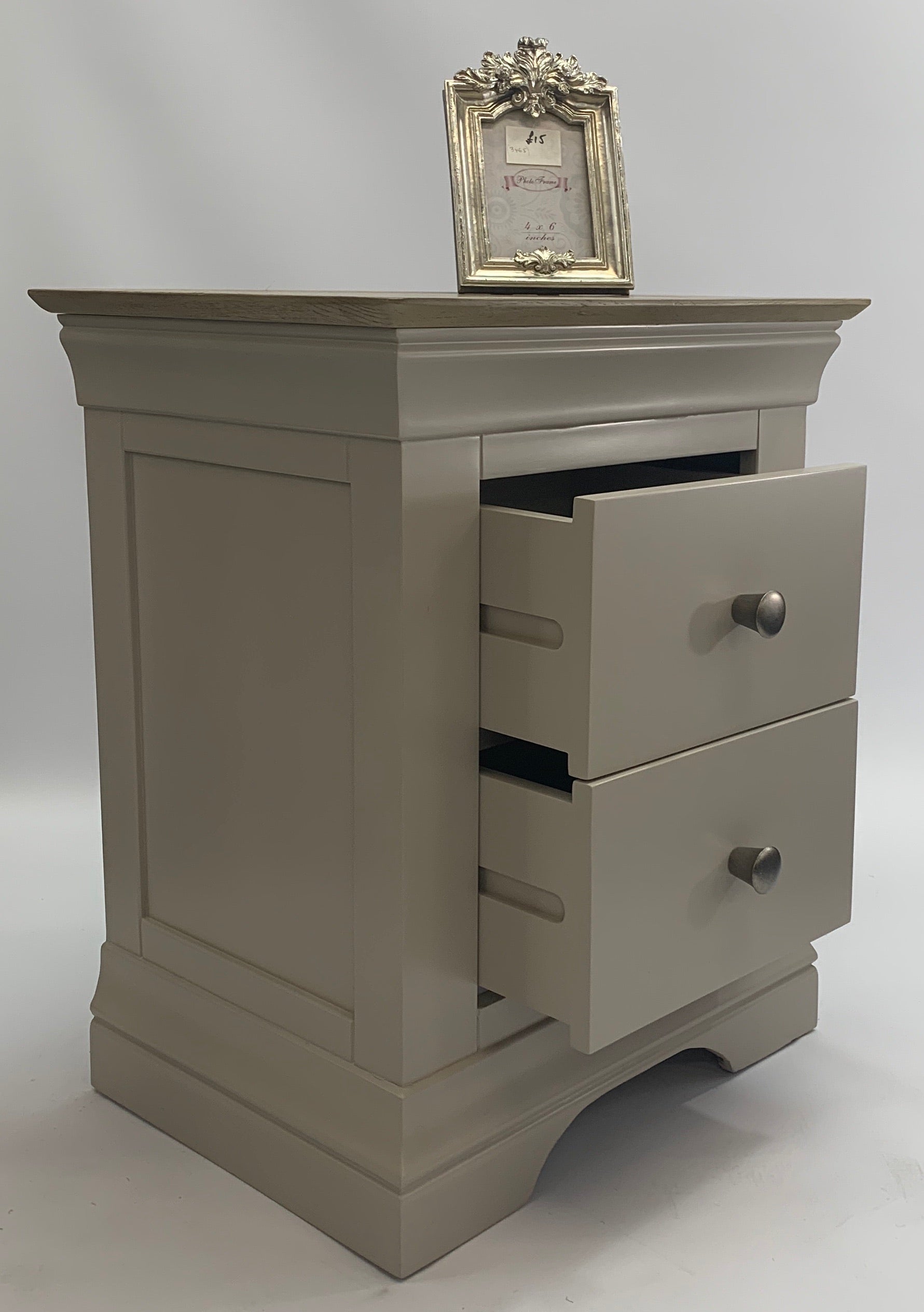 Une table de chevet très compacte à deux tiroirs qui complètera votre chambre. Cette gamme est proposée en finition peinte en gris avec des plateaux en chêne gris lavé et des poignées chromées arrondies.