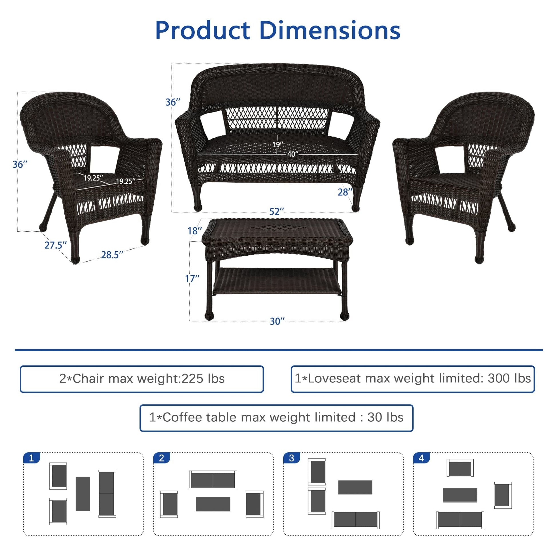 Relax in style and comfort with this exquisite 4-piece wicker patio set that will transform your outdoor living space. Built with high-quality, all-weather resin wicker and a sturdy steel frame, this set is designed to withstand various weather conditions and is perfect for indoor and outdoor use. The traditional white wicker design adds a touch of class to your patio or backyard, while the comfortable settee, two chairs, and coffee table provide ample seating for you and your guests.